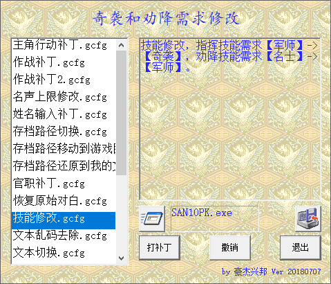 使用方法,打开版本修改器,选择私兵补丁,执行,正常启动游戏就成功了,以后直接点击san10pk.exe就是打了补丁的版本。