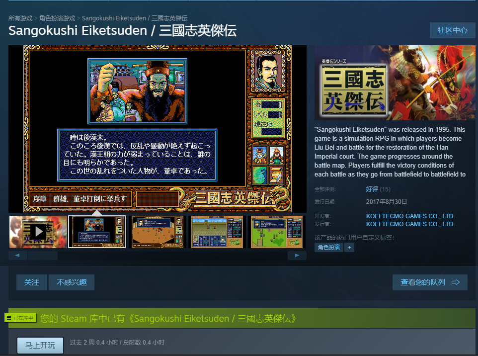 标题: 光荣在steam发布了《三国志英杰传》日文版