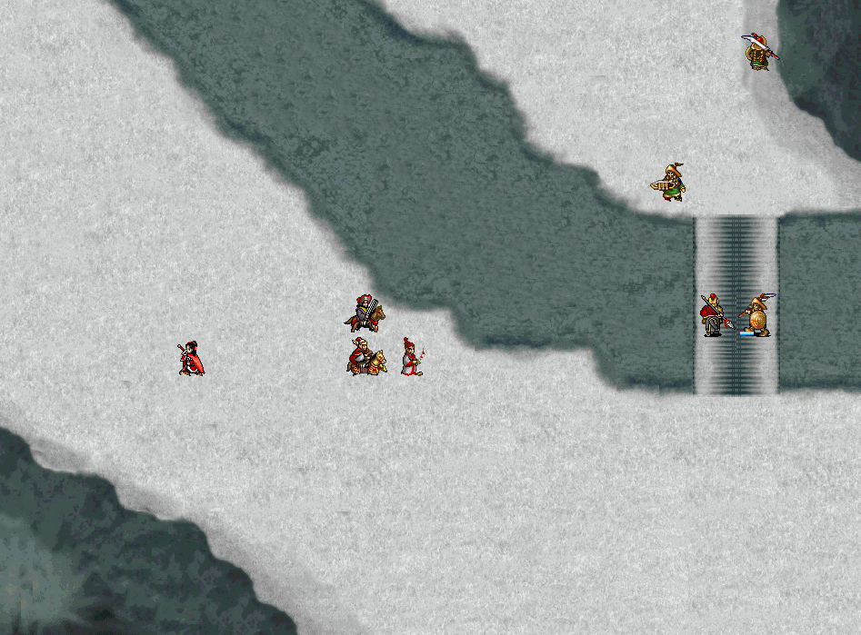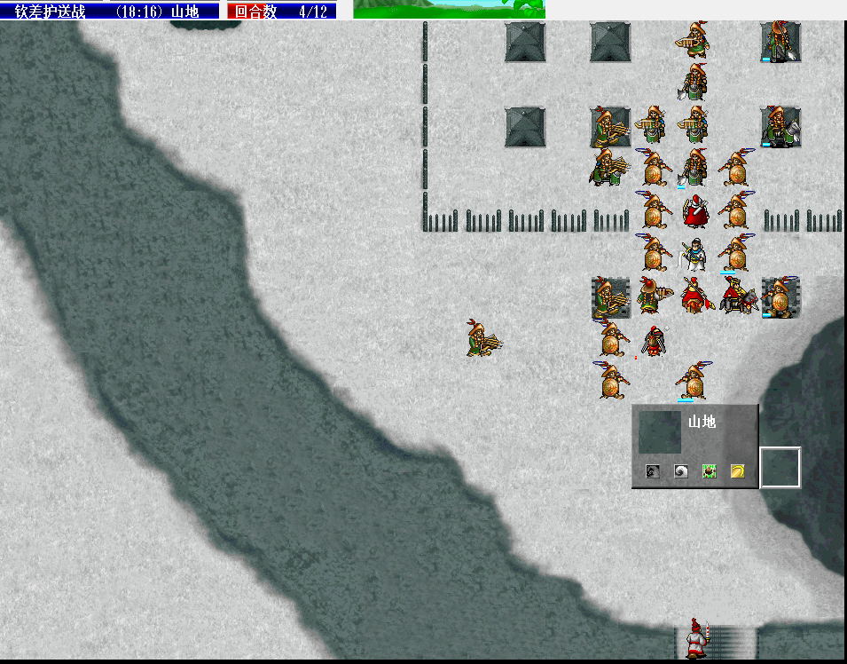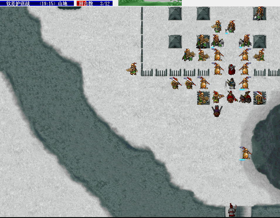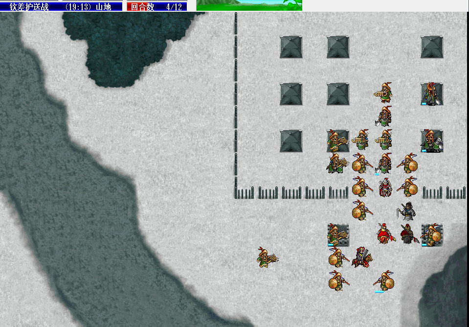 汤怀带震天弓+斗甲+金镖,第一回合走到敌军大营中9个村庄的中间位置气合,确保所有会被所有骑兵包围,不会被金兀术单挑。张九成向右挪开位置自己加防御,不要挡住金兀术和两个弓骑的路,这样他们全军就去攻击汤怀了,等他们离开,张九成上去抢占鹿岩和宝物库拿东西。