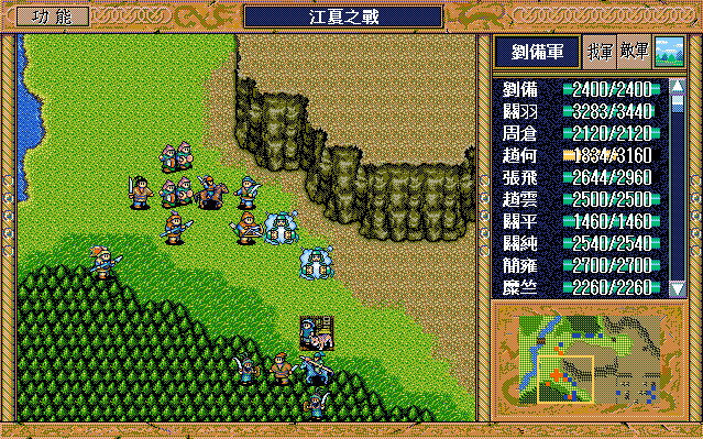 我 周仓左上攻击消灭弓兵1,关平右上激励刘辟,糜竺右激励、赵云左上援助关平,赵何下一,关纯右下、简雍左援助赵何,关羽左下牵制徐晃(失败),刘备右二上二激励自己;