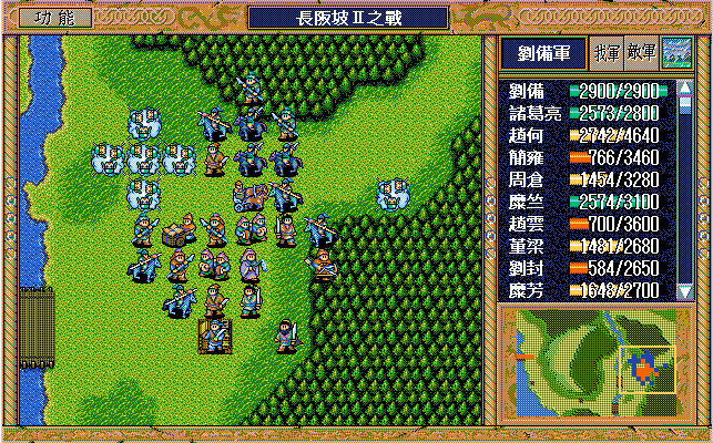 敌 夏侯渊左攻击刘封,乐进左攻击董梁(不反击),张辽左上火龙、夏侯杰左上上猛火周仓(都失败),焦触左方两格浊流刘封(兵力130左右,士气54,长坂坡II之前不再援助、激励他,一是方便长坂坡II开始时的就业,二是士气低了有利于后面群殴曹操),曹洪左方两格火龙董梁(失败),文聘左攻击周仓(三回合),骑兵3左下牵制(难,不用挑拨是为了留下他仅剩一次的策略机会,下回合牵制我方以提供军乐队就业)、骑兵5左方两格挑拨赵云,骑兵6左方两格挑拨周仓(二回合),弓兵1左下援助文聘(二回合)。