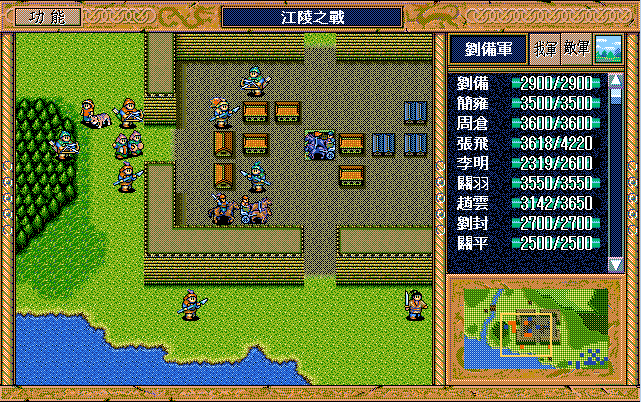 敌 魏延(始终原地,后不说明都是)攻击简雍,步兵2开始原地援助1次骑兵4、3次骑兵2(难,前两次中有一次骑兵4),弓兵3(后不说明都是)左援助武术家,骑兵5下攻击刘备。