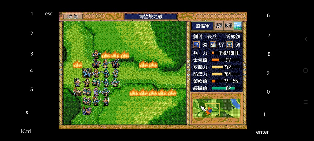 30回合初图,本关策略充足,刘备都可以全策略只是调随机数有几回合没行动,变阵的时候可以给敌贼补策略援助。但是也补不了几次,前面10反击点忙着补血,变阵会有人会补不到贼,后面好多敌兵都40士气以下,激励优先级很高,补了策略也是激励。