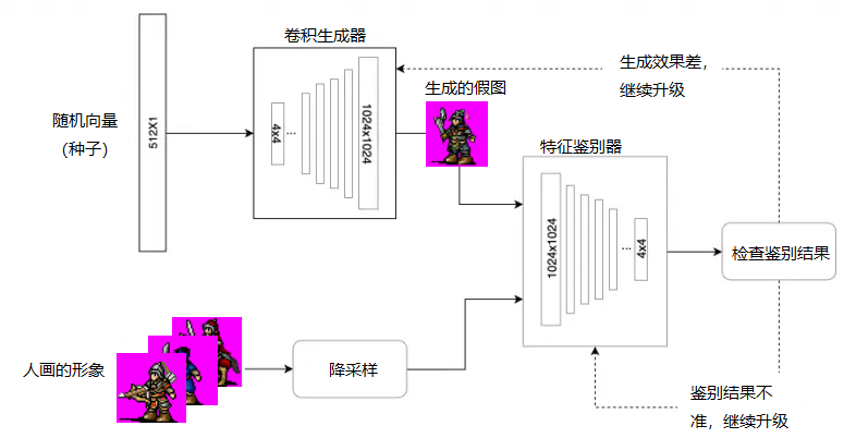前段时间玩了玩网上公开的ai模型,发现头像和地图的生成效果较好,而形象基本上没有端倪。后来想了下,网上公开模型大部分都是扩散模型,不太适合搞像素,所以想尝试下对抗模型(GAN)。