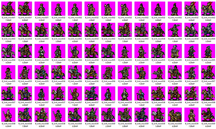 凡事都要从最简单的阶段做起,首先尝试的是单帧形象生成,我一共取了12个mod的全部mov形象,去除了女性、工兵(如炮车辎重)、动物和全部旧比例形象,一共收集了5500张单帧形象。