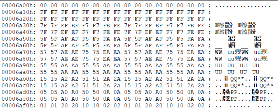 2.然后发现内存中的main.exe 1000:0000开始的数据和存储中的main.exe 6A00开始的数据是一样的,继续浏览能发现它们似乎是按照顺序依次对应上的,我们总算是找到了两者的一点对应关系。