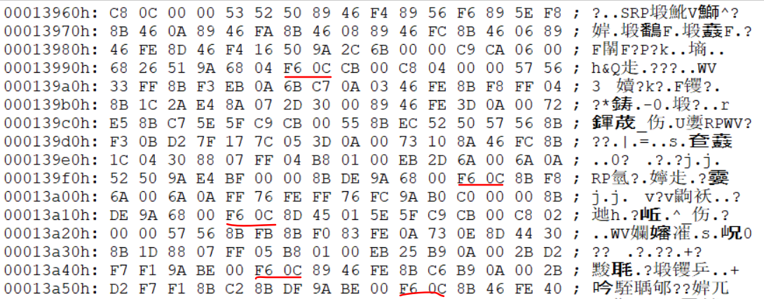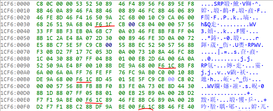 等等,这部分的段地址是1CF6,由于小端字节序的原因,它在内存中的保存的是F6 1C,于是我们可以初步得出一个结论,就是内存中的段地址会修改,这与程序载入内存的位置有关。