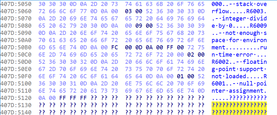 4.浏览到最后,内存中的main.exe的段地址经过了几次修改,变成了407D,而存储中的main.exe的数据到头了,就像两条交汇的路终于到了分叉的时候。内存中的main.exe的内容还在继续不过大部分都是??。