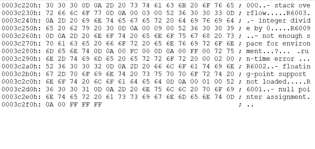在Hex-View界面可以看到类似UltraEdit打开main.exe的界面,看到几乎满屏的16进制数,其实这些数大部分都能与在UltraEdit看到的main.exe对应起来,当然初次对应起来是要花许多的时间的,希望大家都能记住第一次将二者对应上带来的惊喜。