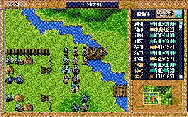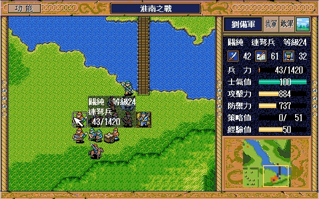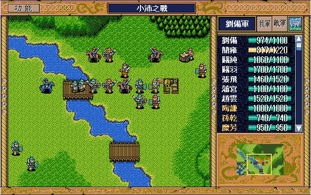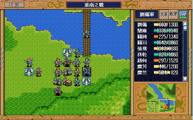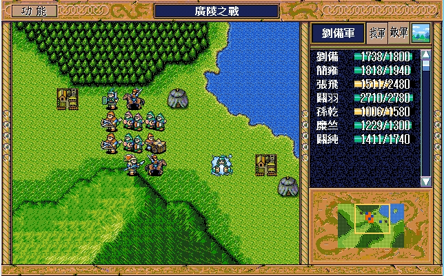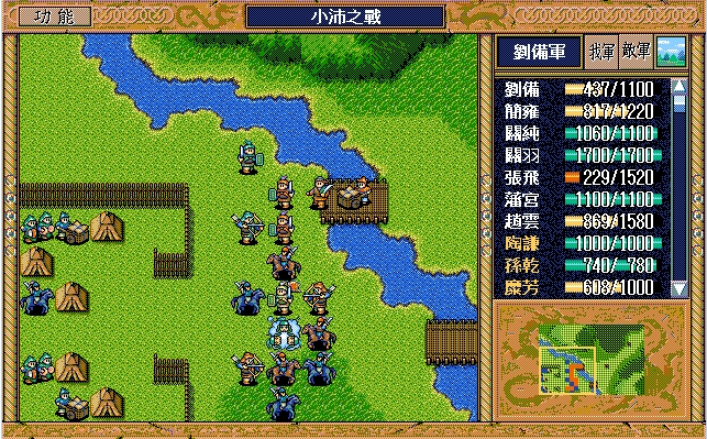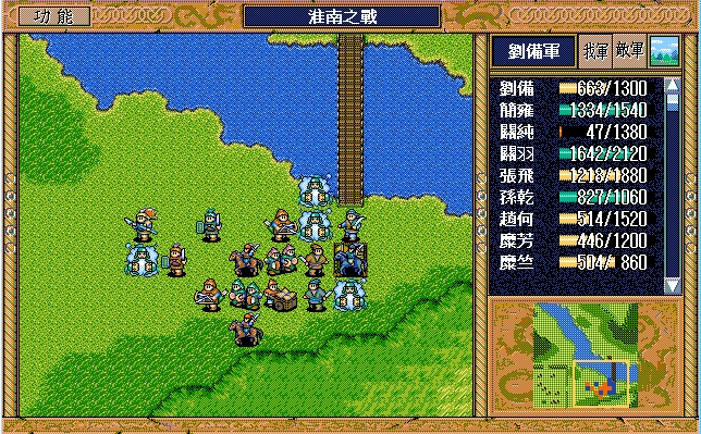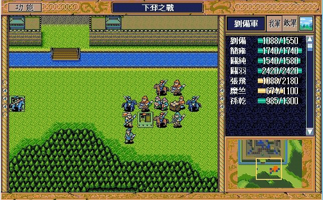 我 关羽右下、张飞右上牵制(都失败)、关纯右漩涡、赵云上、简雍右方两格攻击消灭乐进,刘备左四,藩宫左四下一;