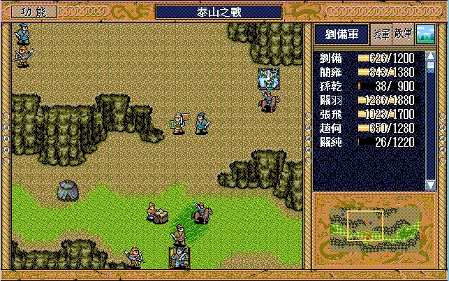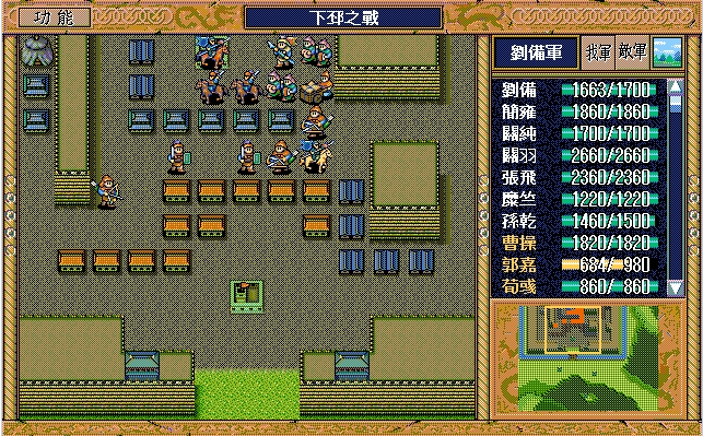我 关羽右三上一激励自己,刘备开始右攻击步兵1,赵云上攻击、关纯原地漩涡消灭于禁,藩宫右上、张飞右攻击消灭步兵2,简雍右假情报弓兵1(失败);