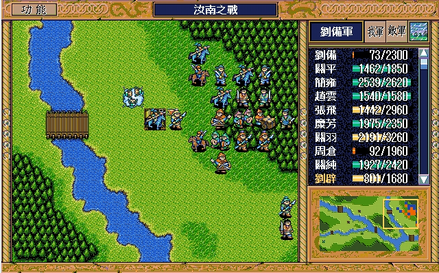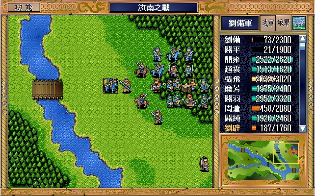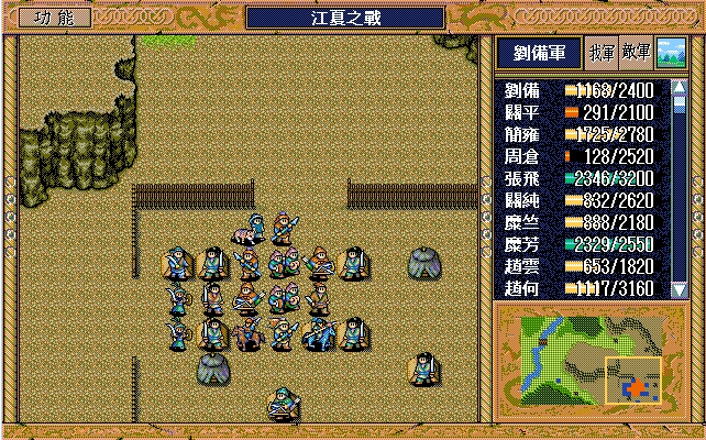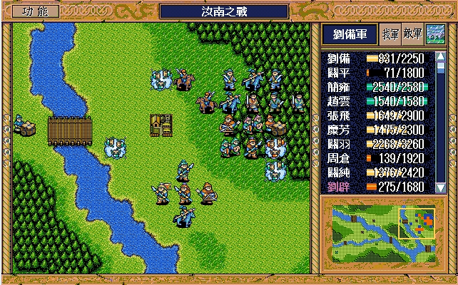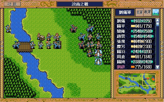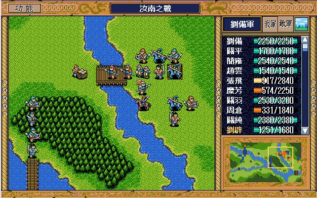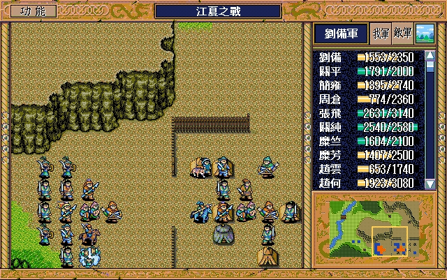 刘备(赤兔马、方天画戟),孙乾;关平(剑术指南书、长枪、3火龙书),简雍,赵云(七星剑、火龙书),张飞,糜芳,关羽(焦热书),周仓,关纯