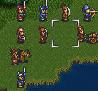 曹操不会主动出击,派刘备去引他,低级别的打他,一下就是半级。曹操没有武器,但还是有“玉玺”,加上他会援助,不必担心打死了,刘备也可以磨些经验。可惜只有一个村庄,MP不够三个骑兵打的。最后刘备去左下村庄。