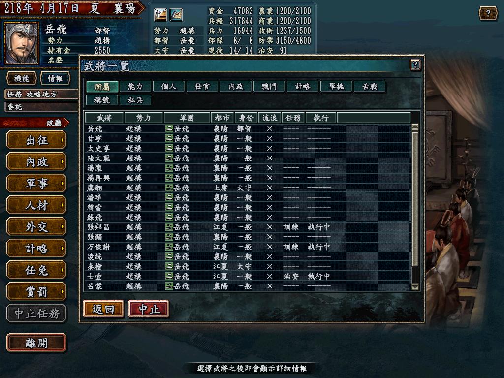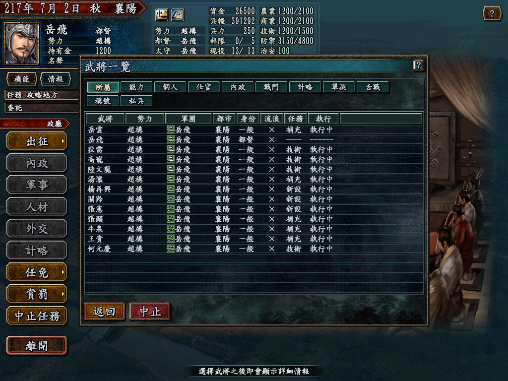 下面借用毛的“说岳剧本”,因为这个剧本里一开始岳飞就是都督还只有一个城市,而且岳飞手下是没有一个军师的,有军师的需求,和我需要的条件刚好混合。