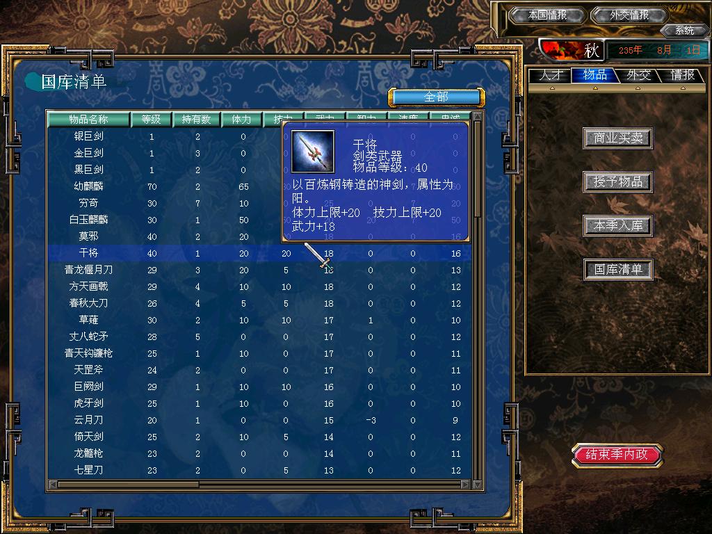 1.关于港口和关卡。这2个是保证后方安全的重要设施,不过我并不完全赞同2个都要守的看法。关卡一定守好,港口则相反,进都别进(除非你的兵力已经很充足了)。但是在港口附近的城里则要布置重兵把守。为啥?港口有个最大的好处,在这里吃败仗的武将全都是朝海上逃跑的,敌人的主力一般都是在城里,这样敌人逃跑出来的部队往往无法得到补给,而一支部队最多只能连续撤退3次,之后武将必然被俘虏。这样咱就可以用主力将敌人港口里的武将攻击出来,然后派一只小部队猛追穷寇,我的80%以上的将领都是在海上俘虏的
