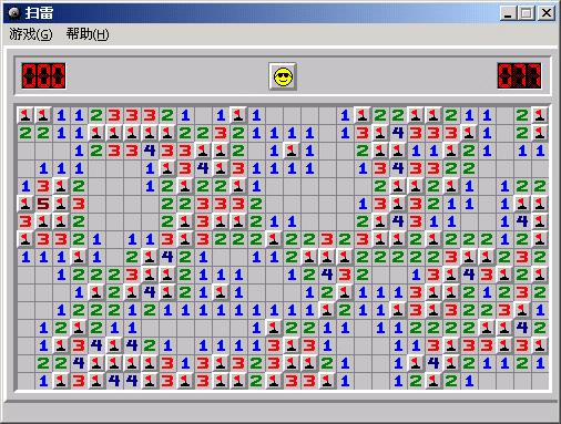 寻找常见的数字组合,这通常会指示地雷的常见组合。例如,在一组未挖开的方块的边上相邻的三个数字 2-3-2 表示这三个数旁边有一排三个地雷。