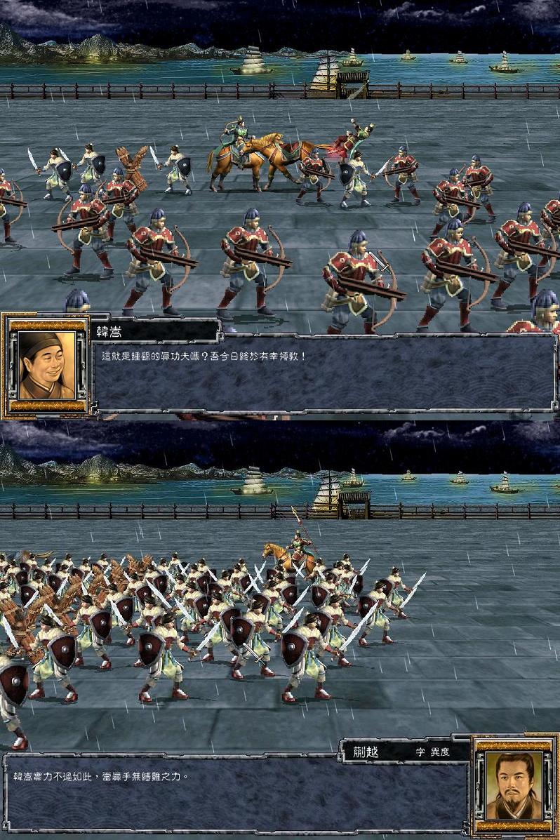 偶:你不用怕,我已经调查清楚了,敌军的将领跟你是半斤八两,没事,你用弓不错了,不用和他们近战阿!瞄准了狠狠地射!你还有弓自带的武将计阿落月弓呢!没事,注意躲开敌人的小兵阿!最好搞俩个步兵自己防防身!