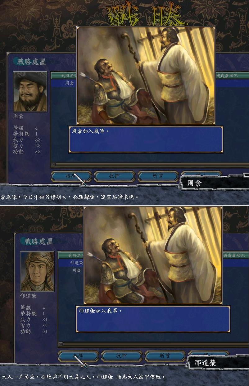 3、打败的武将从不俘虏,降就降,不降就放;更不能杀!