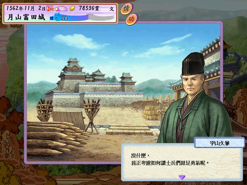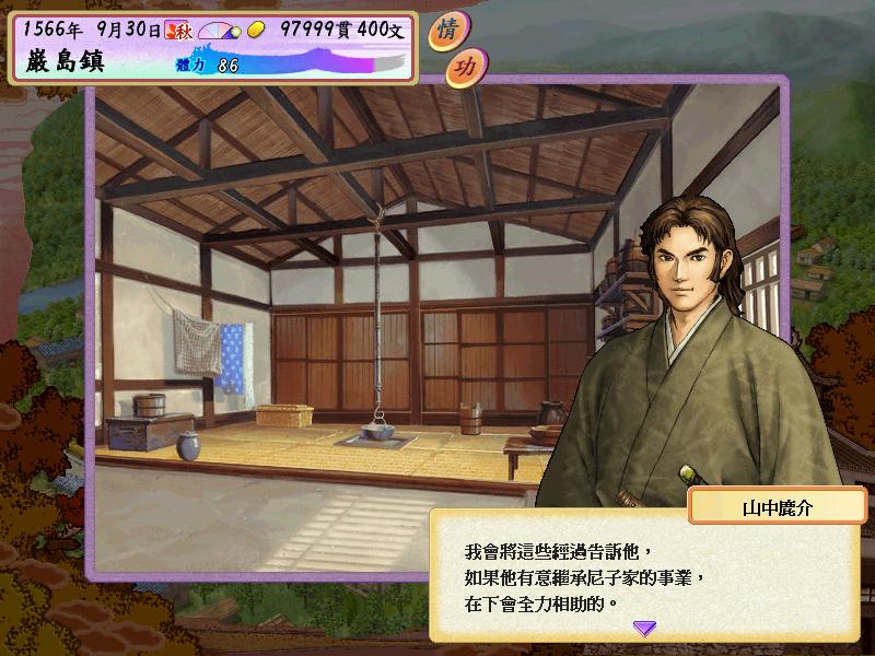 选第一个年代,开始的奖励点数把武力加到80,其他全部加到统率上,此时的我还是一个刚刚出道的步兵队长,头一次开会就惊闻三刀屋城主三刀屋久佑叛投毛利家的噩耗,从此主公一直心灰意冷,除了汇报任务再也不见任何人.没办法,咱人微言轻,先好好锻炼自己好了.第一次任务选倒卖军粮,赚个几千贯以资家用,然后去商人那里将几个统率+10,武力+10的东东收入囊中,哦,还有个价值7的茶器,社交必备.然后后面每月的任务都选修炼,经过不懈努力,已经顺利将洋枪,骑马,医术和算术升为三段,我也升为步兵大将,这期间白鹿城陷落,尼子家只剩下最后的坚城月山富田,浓郁的失败气息在家臣中弥漫着,开会的时候发现佐世元嘉等人也叛逃到毛利的阵营中了.会后山中担心士气太低,于是到训练场巡视,发现宇山久兼散家财提升士气,而且我为了能更好的发挥自己的能力,要求久兼将自己和秋上久家升为侍大将.下月开会,主公竟然说久兼犒赏士兵的钱是挪用公款,要久兼剖腹自尽.幸好自己曾在训练场目睹一切经过,救回久兼性命.不出10天,毛利大军就已兵临城下,15000对8000的悬殊力量对比,1561年,月山富田终于没能守住,主公降了,久兼切腹,逃出来之后和秋上久家商量寻访尼子家的后人,一定要复兴尼子家.