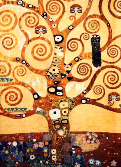 1909年,克里木特为布鲁塞尔斯托克莱特公寓的餐厅创作的壁画《生命之树》,大胆而自由地运用各种平面的装饰纹样,形成富有东方色彩和神秘意境的效果。