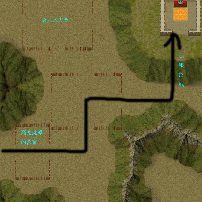 自己有个想法,金银铜铁的营是通往山上的;可营后面还有一小股敌人站在那里不动;需要岳飞的先头部队尽速达到,清理干净后,粮车才可以上山。