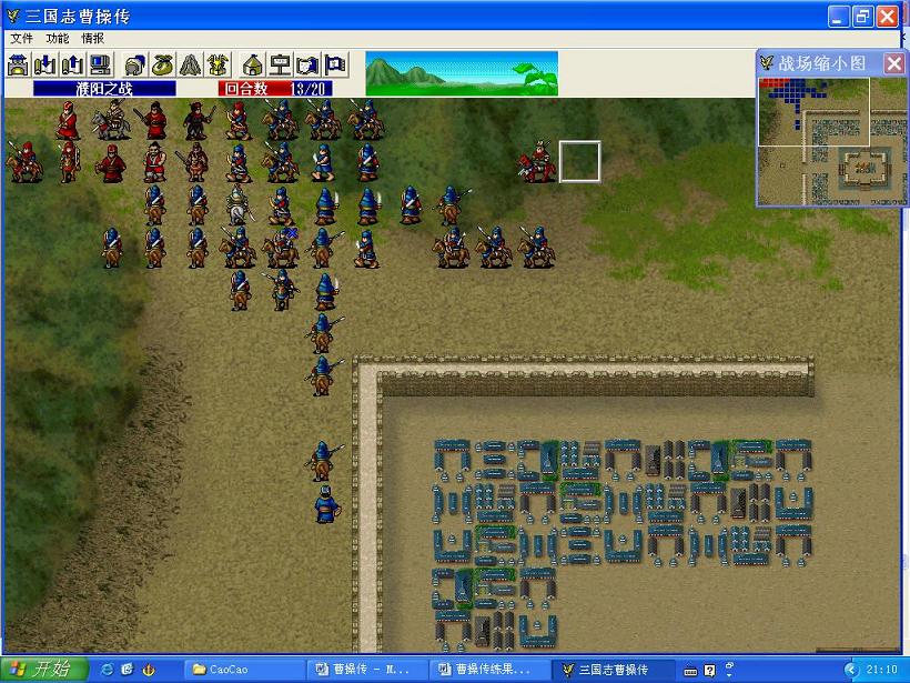 这一关还有一点特有意思,第十八回合,第一排前面站满敌军,这时一弓骑左移一步过来射妙才,妙才不想升级于十九回合躲进左上角,弓骑先动前进两步射典韦,二十回合曹操无法移动,遗憾终年四十岁...........