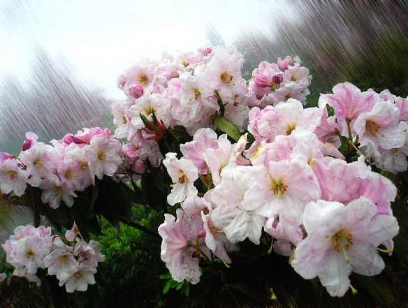 路的两边,杜鹃夹道,高高的杜鹃树,盖过了路的上方,盛开的花朵,互相对视,情意绵绵。
