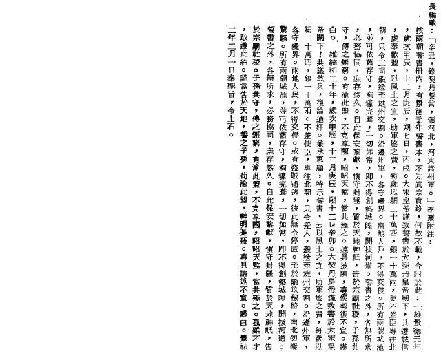 嘿嘿,我把檀淵之盟的誓書給發上來吧。摘自蔣復璁的《檀淵之盟的研究》所引《長編》李燾注。圖片係QQ照的,像素有點低,可以下下來放大了看。呵呵。