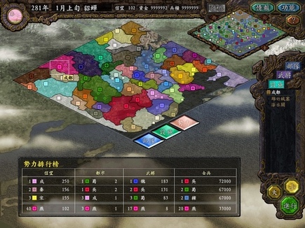 当选择小势力的玩家登场后,别的什么也别管,什么筑城之类的都放下别管,就是征兵训练,然后抢个某势力的地盘(由于初期多数势力都只有一城,攻下了他的武将就都是你的了),再发展,不然恐怕玩不下去的。特别是魏蜀吴三国周围的倒霉蛋们