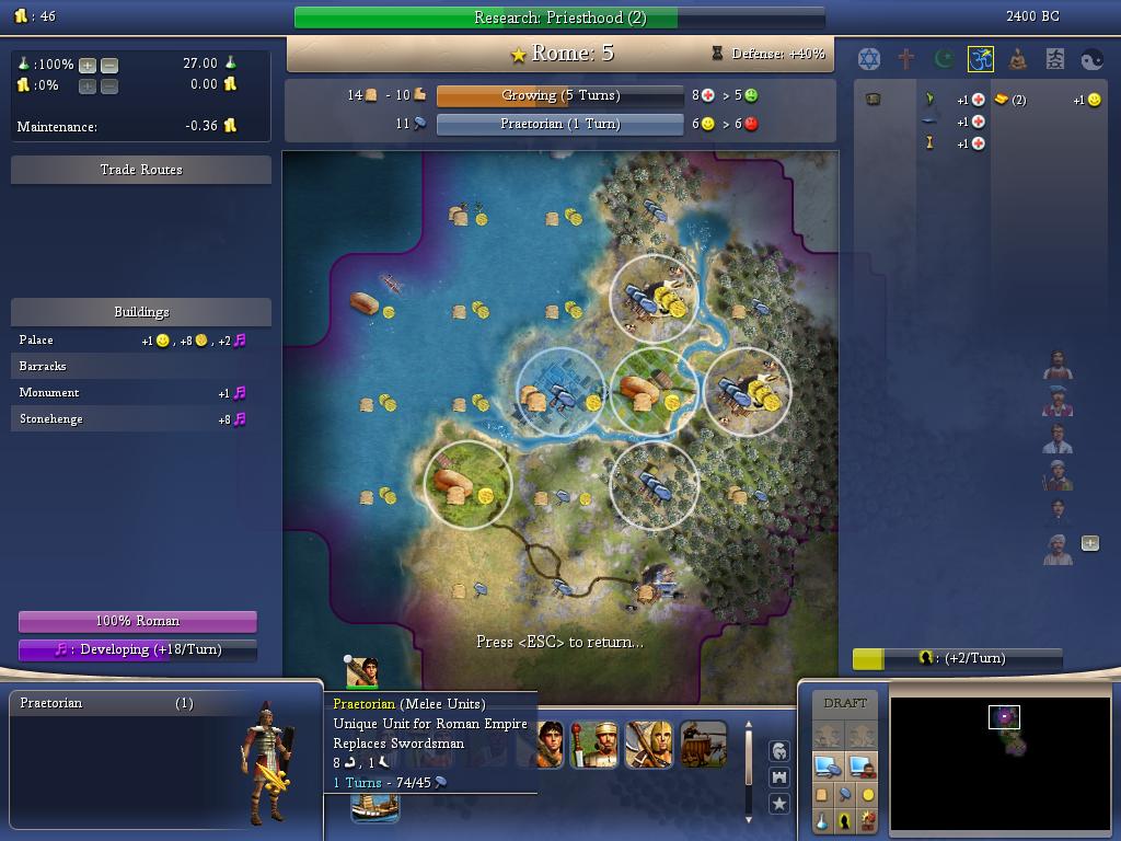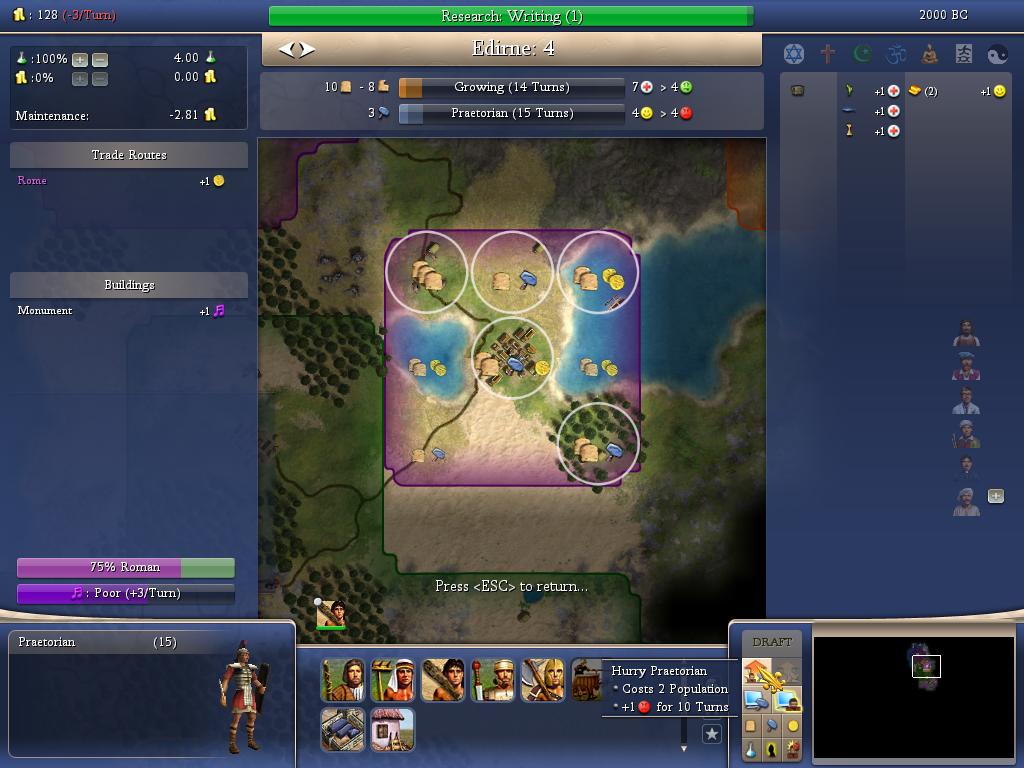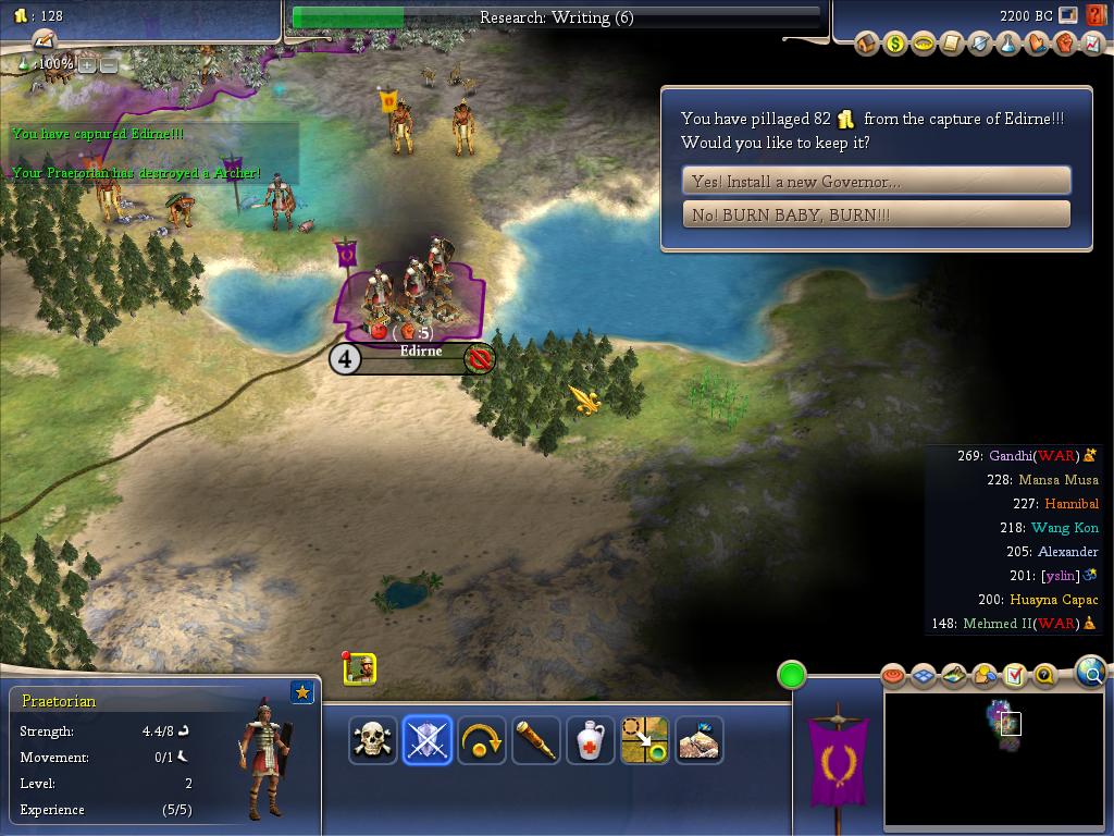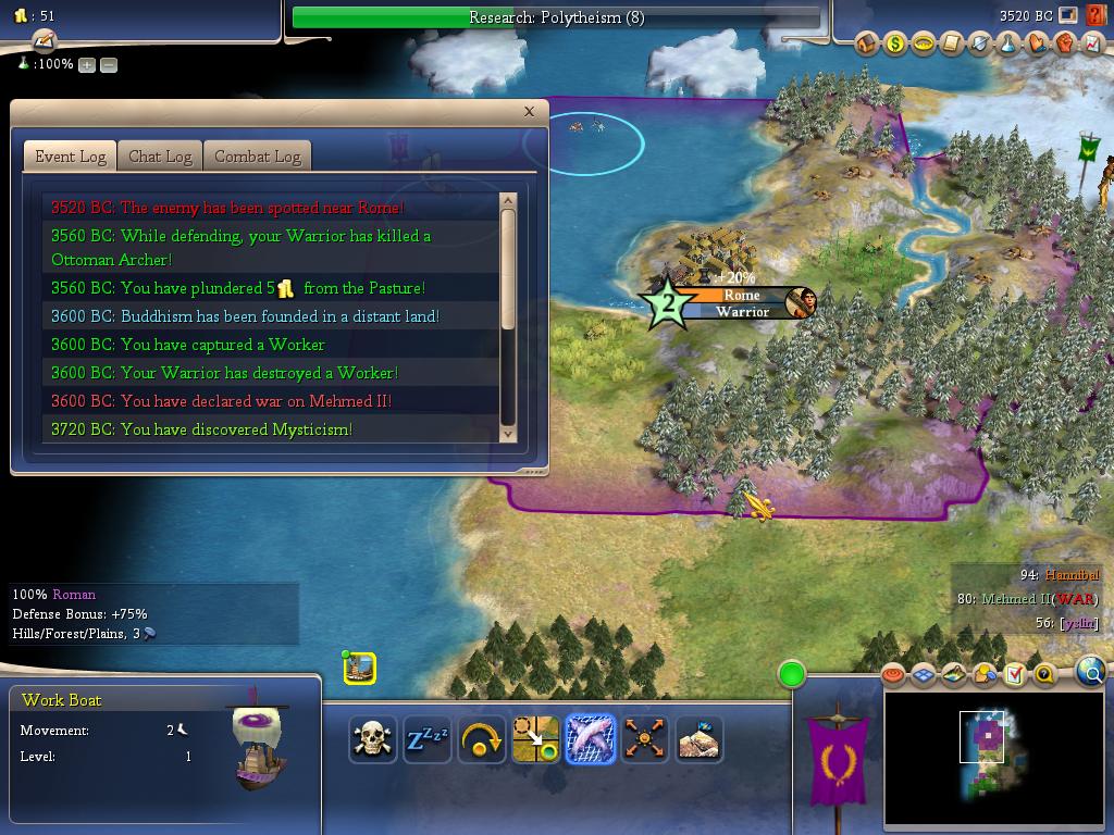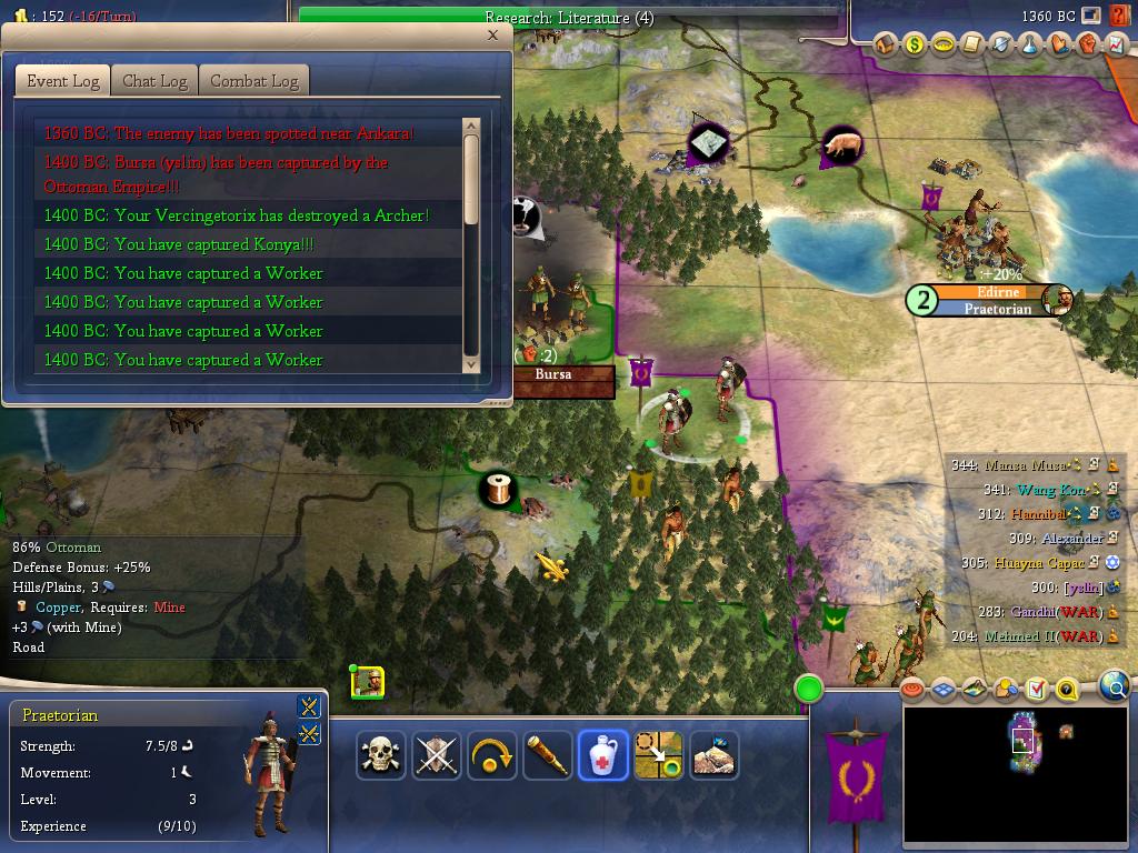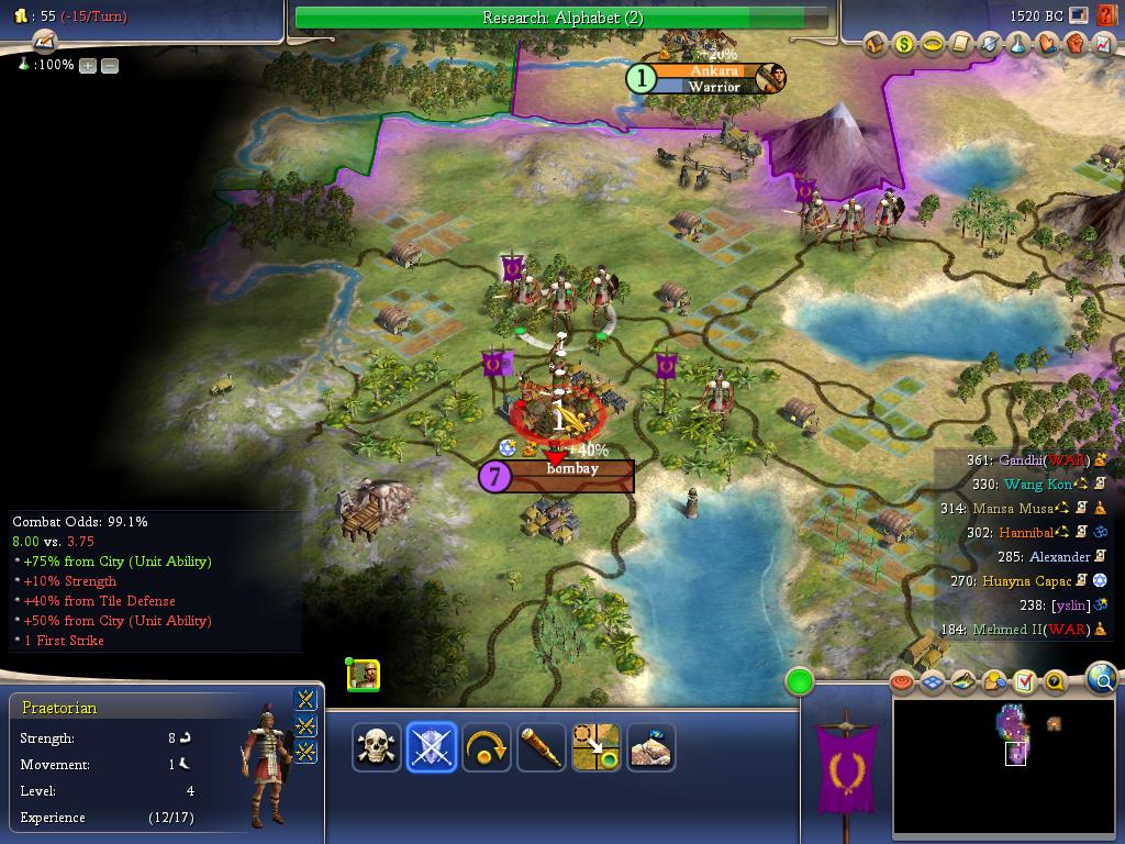 顺便说说抢工人的技巧,一般AI会很快去连首都和分城之间的路,你的武士只要站在中间地带等,很快就会有工人送上门了。距城2格以内的工人最好不要尝试去抢,大多数情况有去无回,少数攻击性不强的AI可能不会主动出城攻击你。