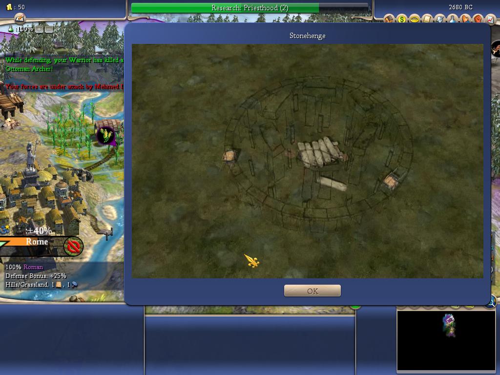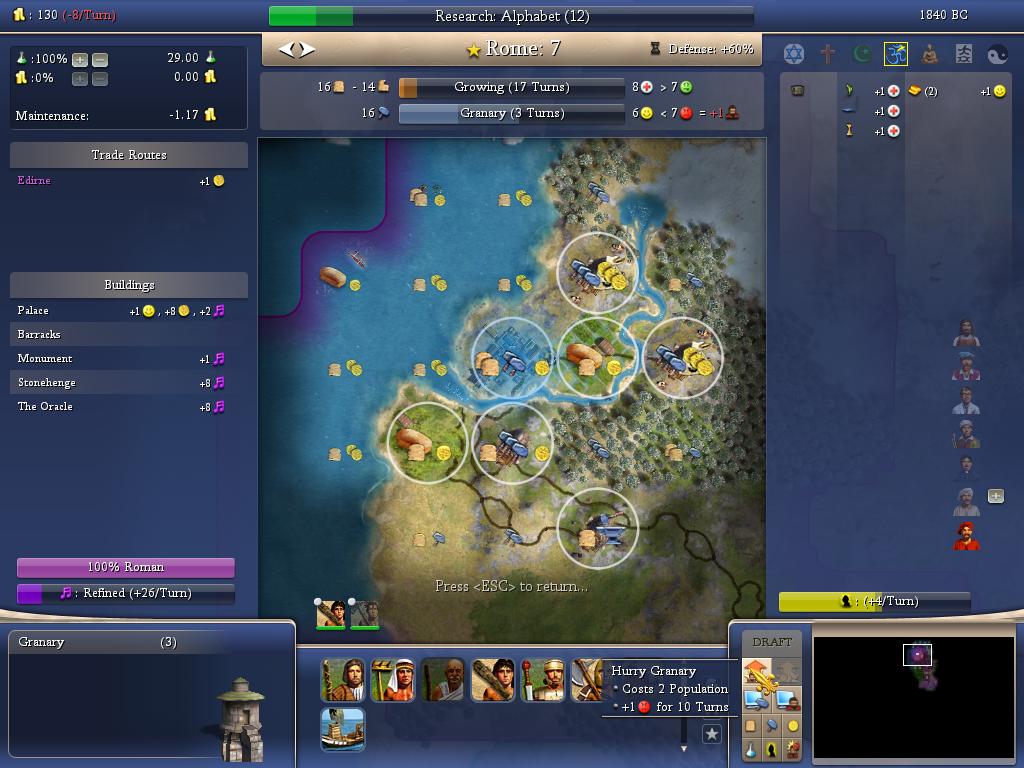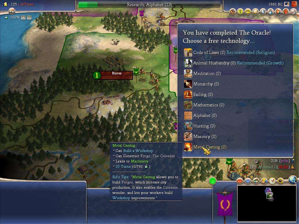 出生地非常之理想,靠河临海、4个面包、2个钱袋子、周围居然有8个丘陵(其中还有个上面有铁),哪儿也不去了,就地建城。首都出个渔船先,这么高的生产力当然要考虑抢巨石阵,所以首先研究神秘了,还可以看看能否抢个宗教玩玩。巨石阵对于有创造属性的领导人意义不大,不过多2点伟人出生率将会大大提前第一个伟人的出生时间,8点文化也可以加快文化扩张。