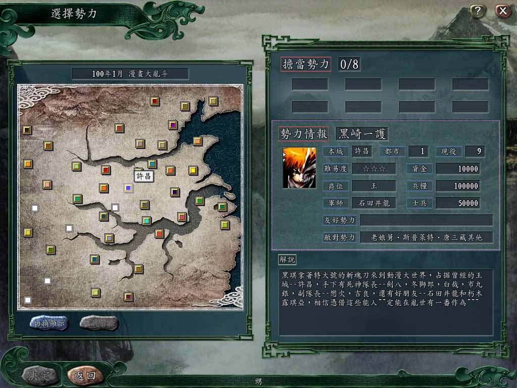 大学暑假太无聊了~~就想做个有趣点的剧本~~目前就制作了这几个势力~~本人已觉得江郎才尽~~望各位感兴趣的大大提供一下素材~~人物(最好是一个势力,单个人物也可以),头像(最好是动画风格的)还有数据(最好有特技),也好让本人早日完成,放出大家下载~~谢谢,PS;如果没人回帖的话,本人就认为大家没社么兴趣,那样就不放出下载了~~~