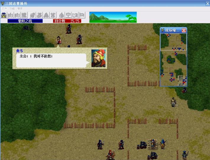 第一回合,典韦凭借爪黄之力,进入区域(0,0)-(19,28),也就是越过第一道栅栏,引发栅栏里的7名敌人主动出击,曹操引一个弓兵,不要让他挡典韦北上的路,张辽引那个步兵,曹仁往上走准备过栅栏,其他人往袁谭所在的城里走。