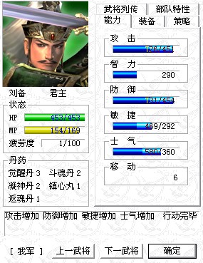 (p.s. 1、镇心丸在原功能基础上增加一个功能,我方是疲劳过高时可恢复疲劳,电脑带着则意义更大,每回合恢复的疲劳值=镇心丸数量;2、敌人也会携带丹药,例如虎牢关的吕布带有单挑的两丹和觉醒丹,打起来更不简单。还有,关于单挑秒杀,敌我都是在有单挑2丹其一时才能防秒杀,也就是说,即便敌人是无双武将,只要他没丹,一样有可能被秒)