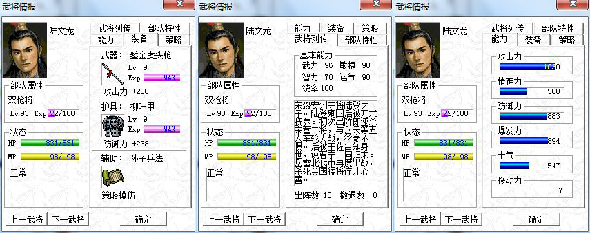 自己虽然装了xp,但主要用的是win7,3月6号兼容补丁出来后,高兴不已,现在win7下可以完美运行岳飞传了,兼我以前最力挺的游奕兵种变成了先手攻击,虽重打了一遍,现在已经到飞线最后一关了,15人主力如下: