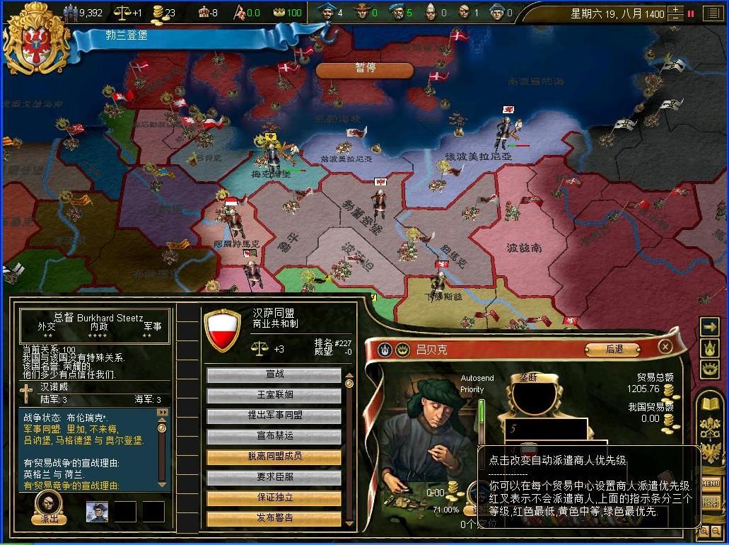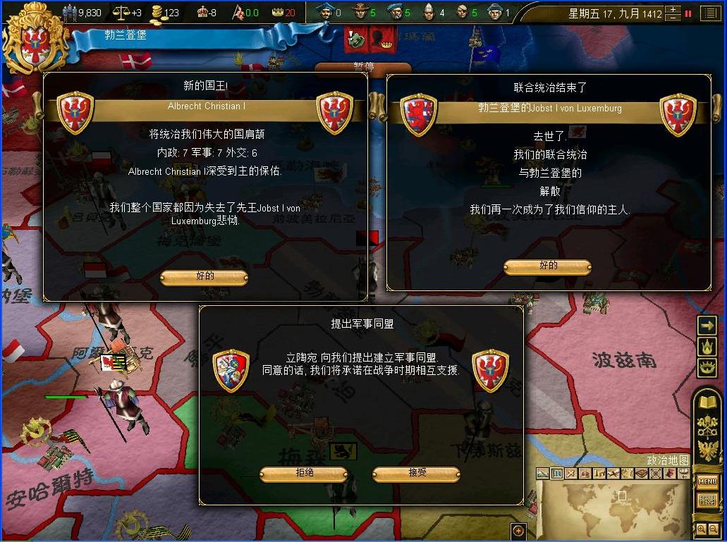 1399年的勃兰登堡,拥有勃兰登堡,鲁平,波兹坦以及钮马克四个省份,军事实力一开始比较孱弱,仅有3000步兵.更可怜的是....居然是在卢森堡的联合统治下.....完全没有自主权的国家.....开局应该会比较辛苦