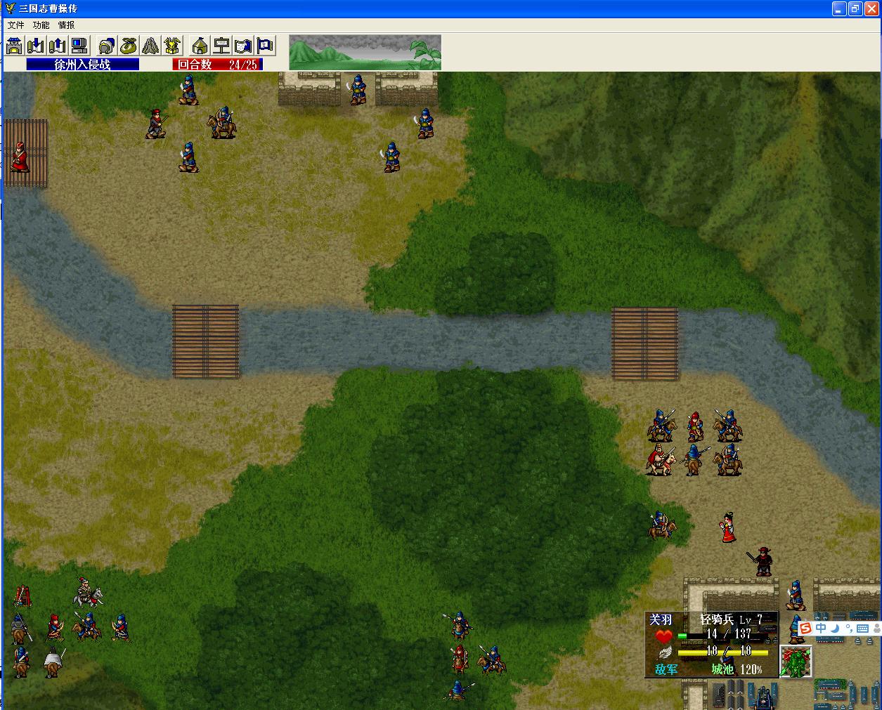 这关和后面一关都有强力友军关羽助阵,相对来说轻松不少,不用自己解决敌人,只要把别人打残,再由关羽击退即可。战斗开始,让夏侯渊和郭嘉出现在颜良的桥下,颜良很神勇,挑掉我军俩将士,选让关羽出战。前两回合站住位置挨打,夏侯渊挨颜良一下就40多的血,真疼。还好,第三回合,关羽来支援了,轻松解决了颜良之后,关羽会过桥,郭嘉和夏侯渊跟进,郭嘉适当的对敌人放下毒烟和炖兵,然后交给关羽解决,夏侯渊站位吸引敌人过来打关羽。很快就能打到袁绍了,适当S/L一下,别让他格挡以及解毒,后面就好办了。袁绍被消灭后,下方还有敌人,同样,用夏侯渊先去吸引,保证关羽每回合都有敌人能打,郭嘉再在旁边吹下,耗满25回合,轻松过关。郭嘉7.93级,其余人无经验,练出一个统帅果,敏捷果,好运果