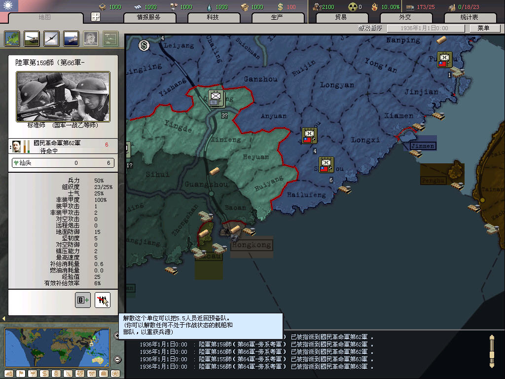 之前开过3.0的档,惨破。这次吸取教训,走精锐化暴兵路线。除了最开始因为全国整编造成兵力不足不得不造42个民兵师外,后面全造常备和标准,并慢慢裁掉民兵。这样人力也省下来了,造出的钱基本用不完。
