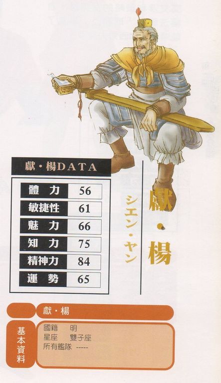 杨贤(CV大冢明夫)李华梅的监护人,明军将领,和李华梅一起来到三国时代。(原来的名字杨希恩出自大航海时代4,感觉非常别扭。考虑到海4坑爹的音译,很可能杨贤才是正确的名字,故改。)