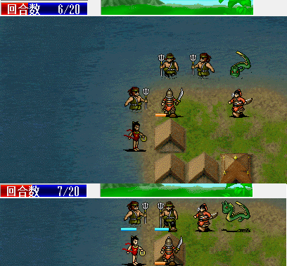 第四回合,利用残血启军,引二友军走位杀敌,SL一下全忠和老爸多格档两下,省下粮食