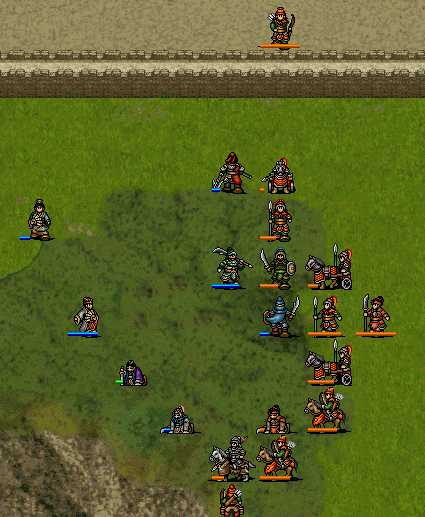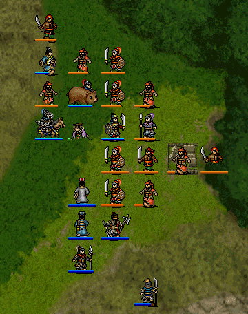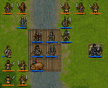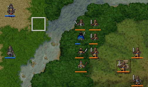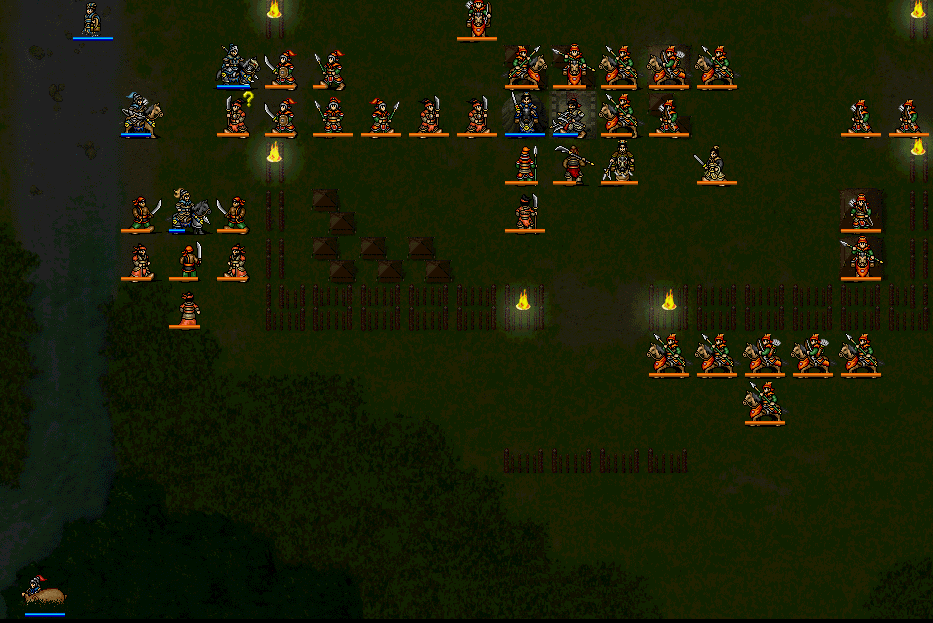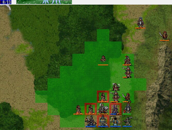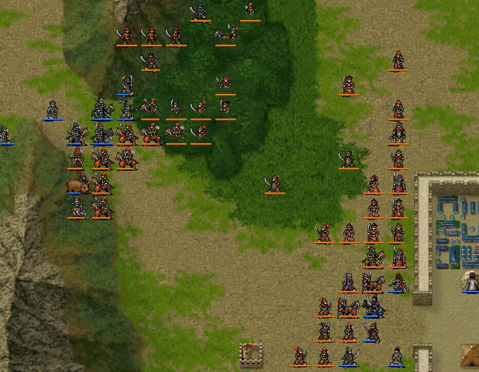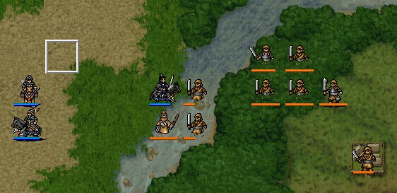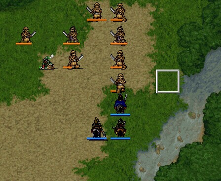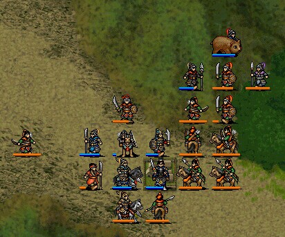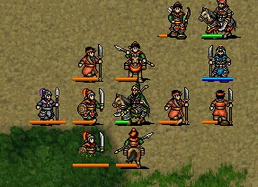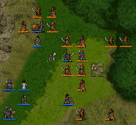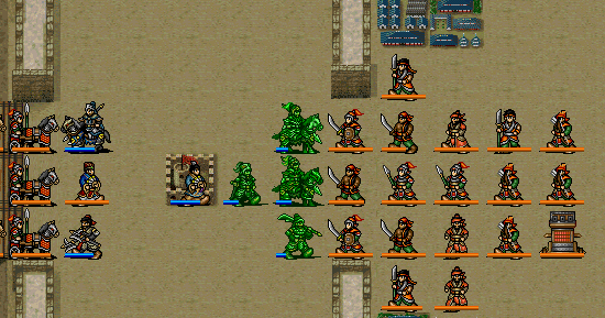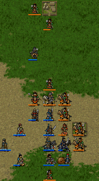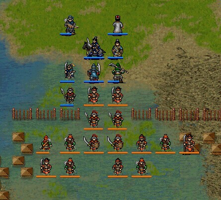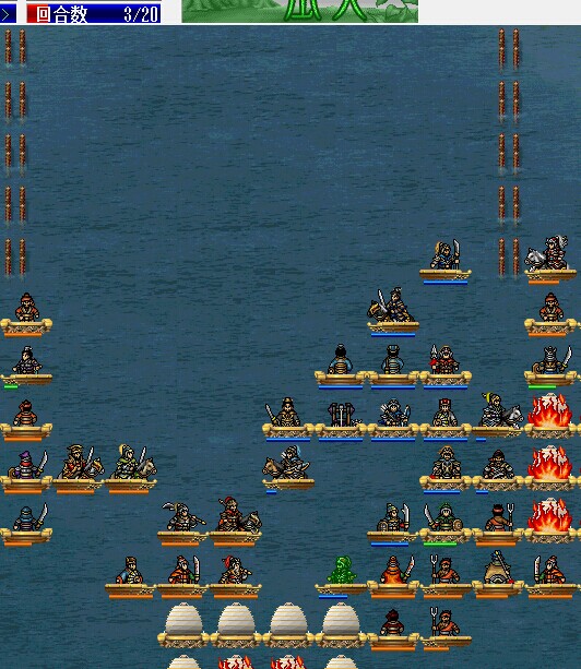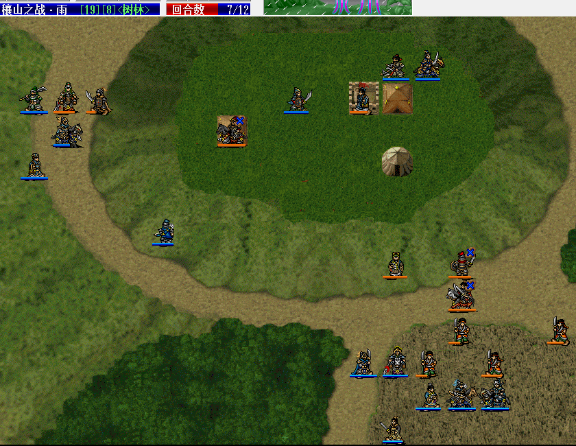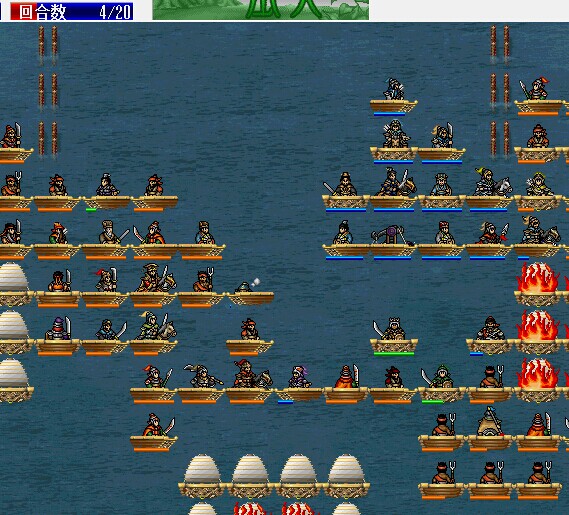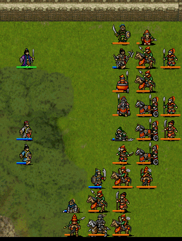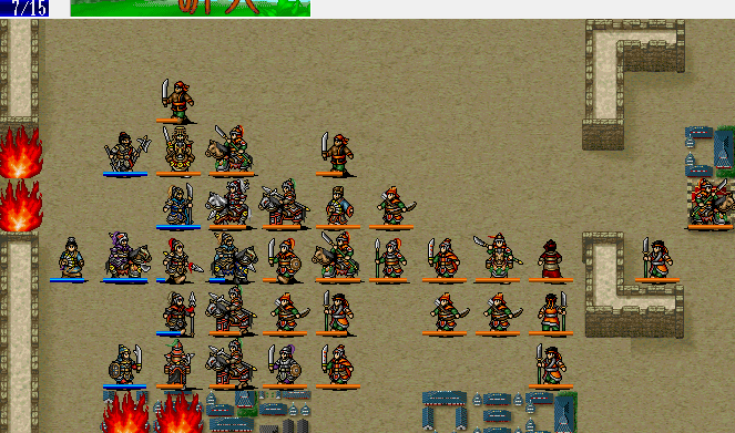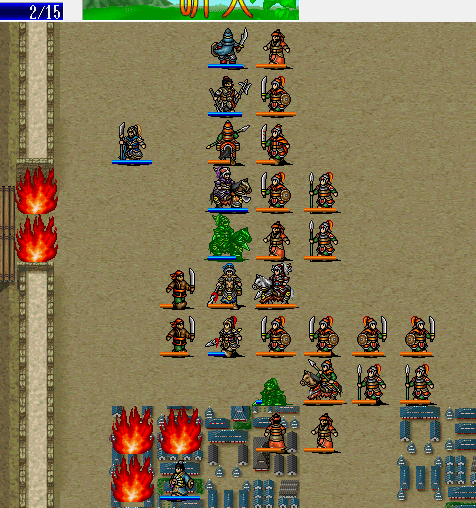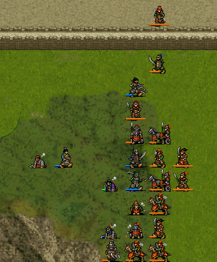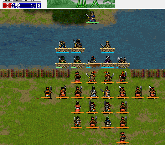 第一回合孙坚后撤,集体往前走一点,小夏侯走到袁绍前面步兵的斜下方把敌人的一个步兵勾引过来砍他(还有个弓兵也会过来射他)敌军阶段黄盖程普撤退。