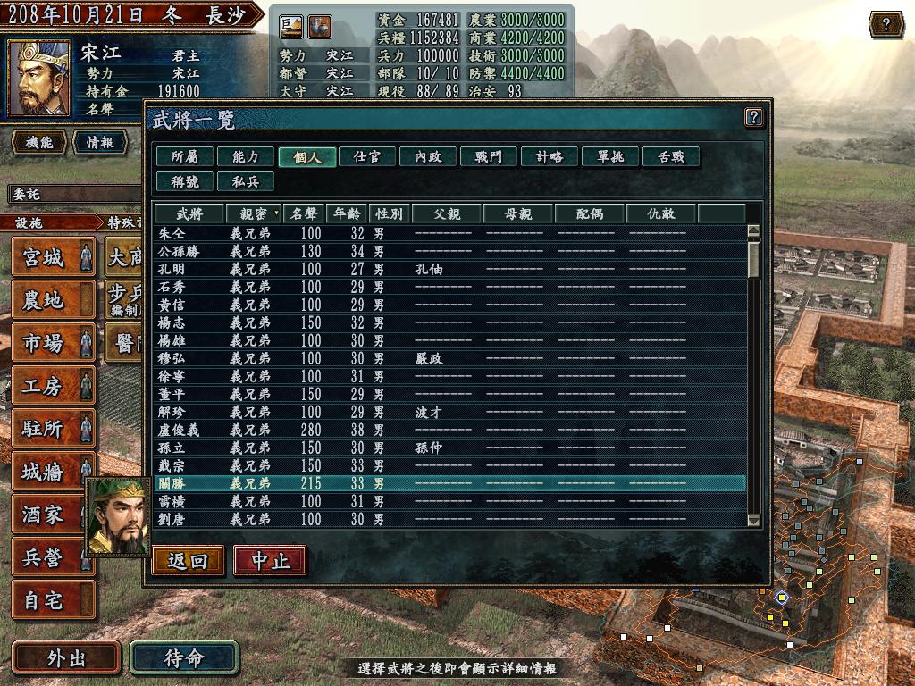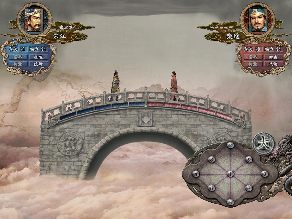 背景选为207年的剧本,操纵人物为宋江,宋江等108将皆于长沙在野,彼此之间亲密度都是100(但宋江又都不相识,除了对扈三娘和宋清),宋江有私兵10000,同时也有几个头领也是有私兵的,就看玩家怎么举旗兴兵,与天下争衡了!108将流失的速度也很快,先占长沙还是先聚齐108将,由您自己决断!