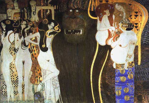1900年,克里木特把被维也纳大学退回的壁画在巴黎博览会展出,受到青年艺术家的热烈赞誉。从而奠定了他在奥地利画坛的领导地位。1902年,和雕塑家克林格尔一起承担贝多芬音乐厅的装饰工作,主雕像《贝多芬》由克林格尔完成,雕像背后的墙壁上,由克里木特创作了装饰性饰带《音乐》,十分成功。