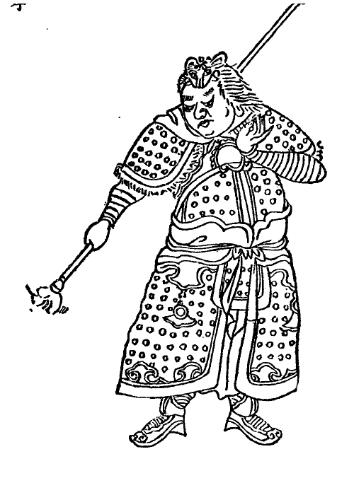 武器:齐天槊,长长的杆儿,前边一个拳头,攥着一管笔,后边一个大攥。