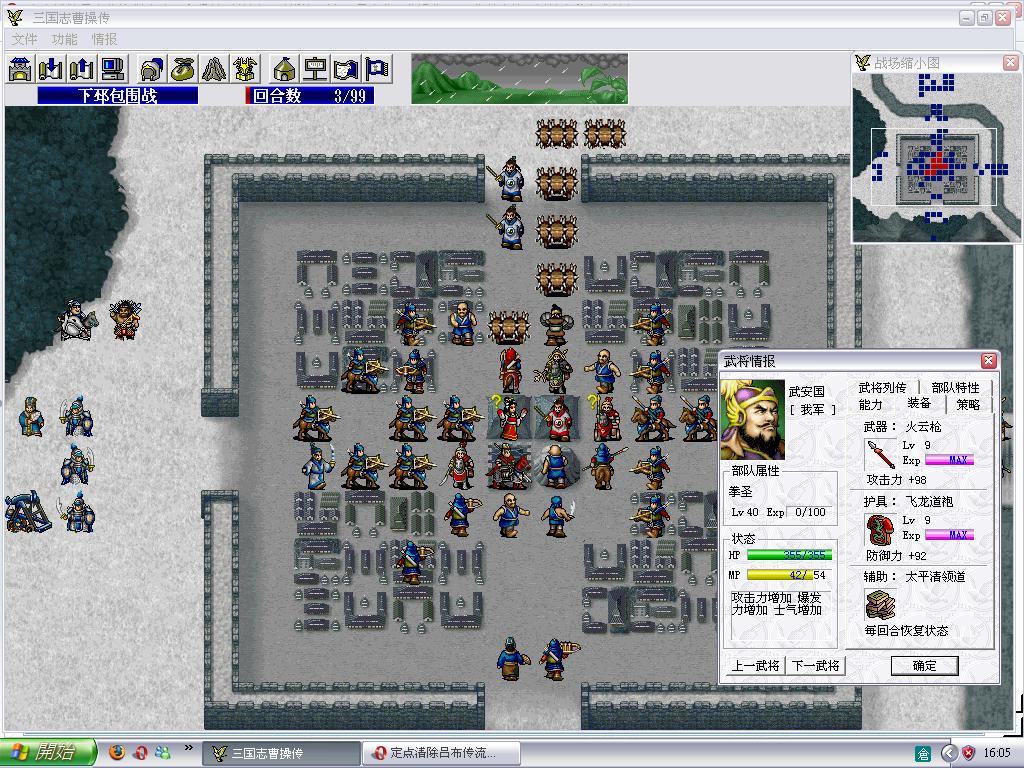 几次伏兵都不足为惧,最后与曹彰进行骑兵大会战,吕布父女实力还是太强了,物理攻击以一打十都不怕,轻松过关.特殊奖励飞龙道袍,印绶和龙王丹.曹彰似乎比夏侯敦稍微强一点点,原因是我方弓手能力不强.