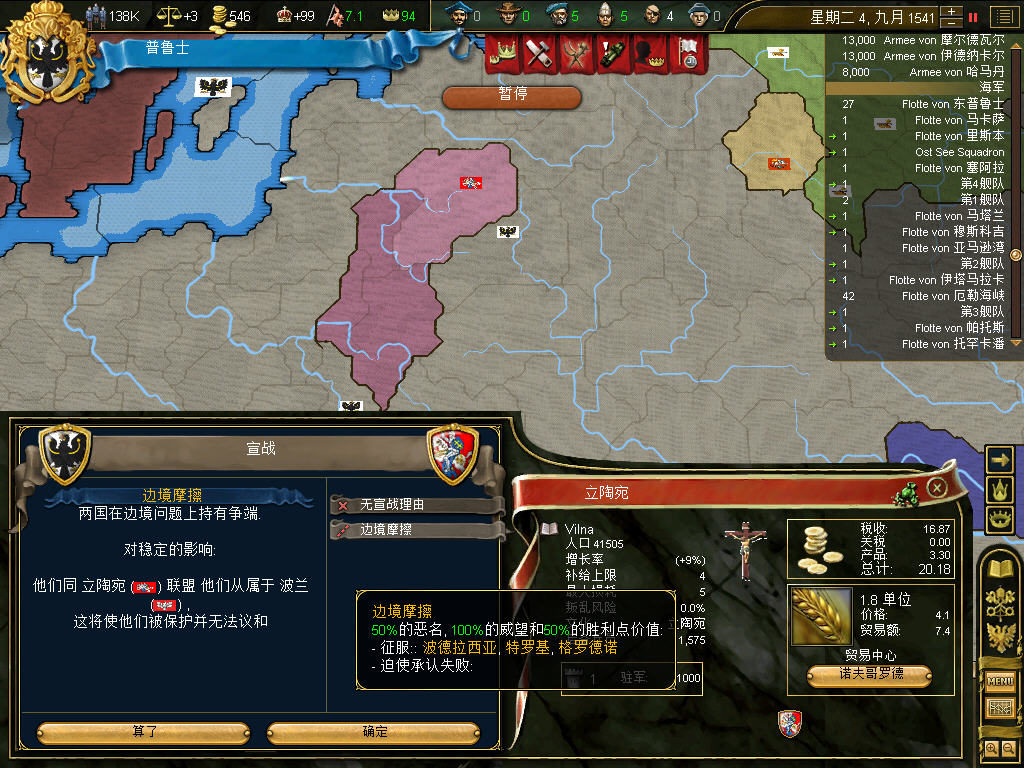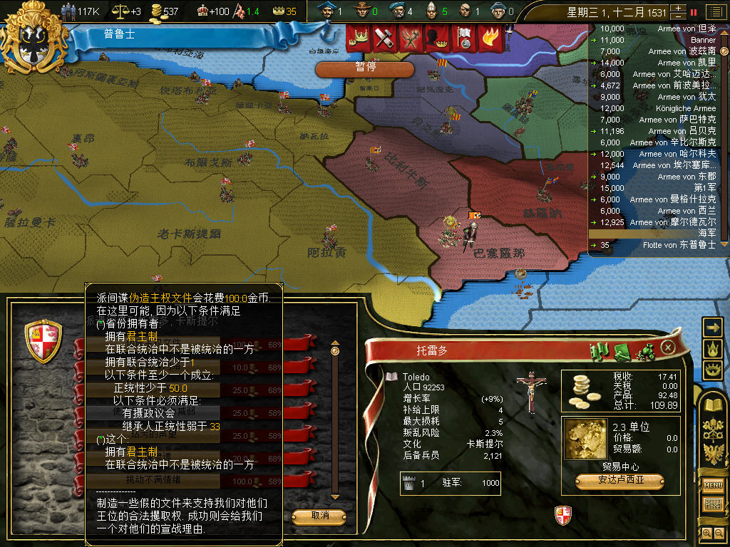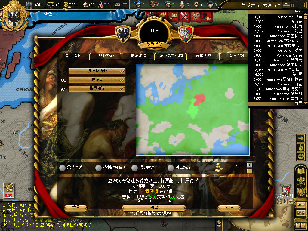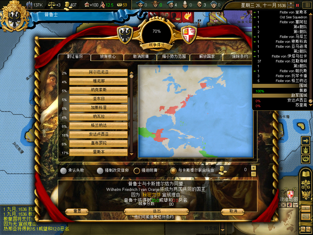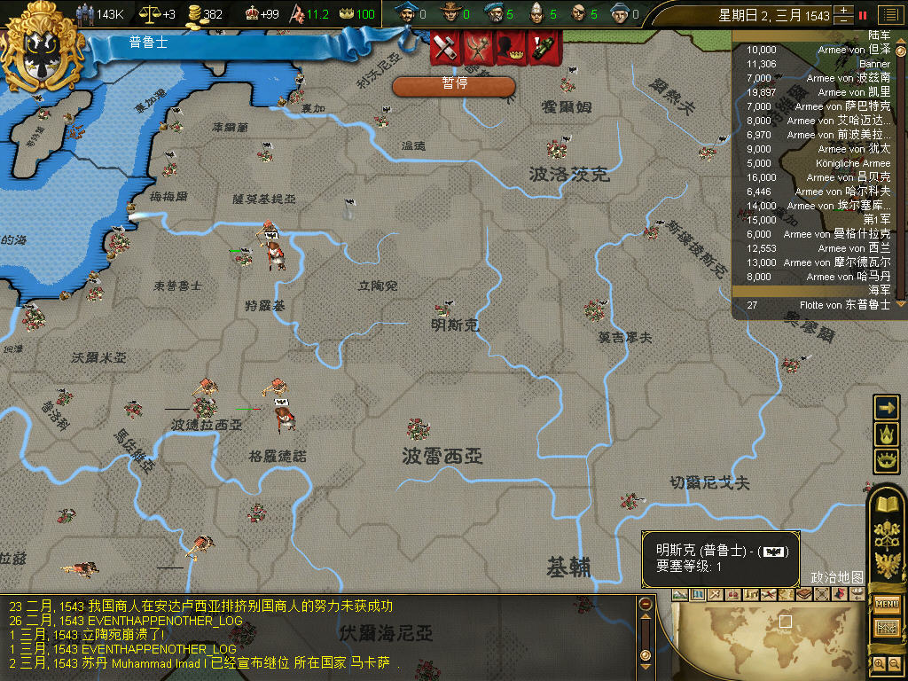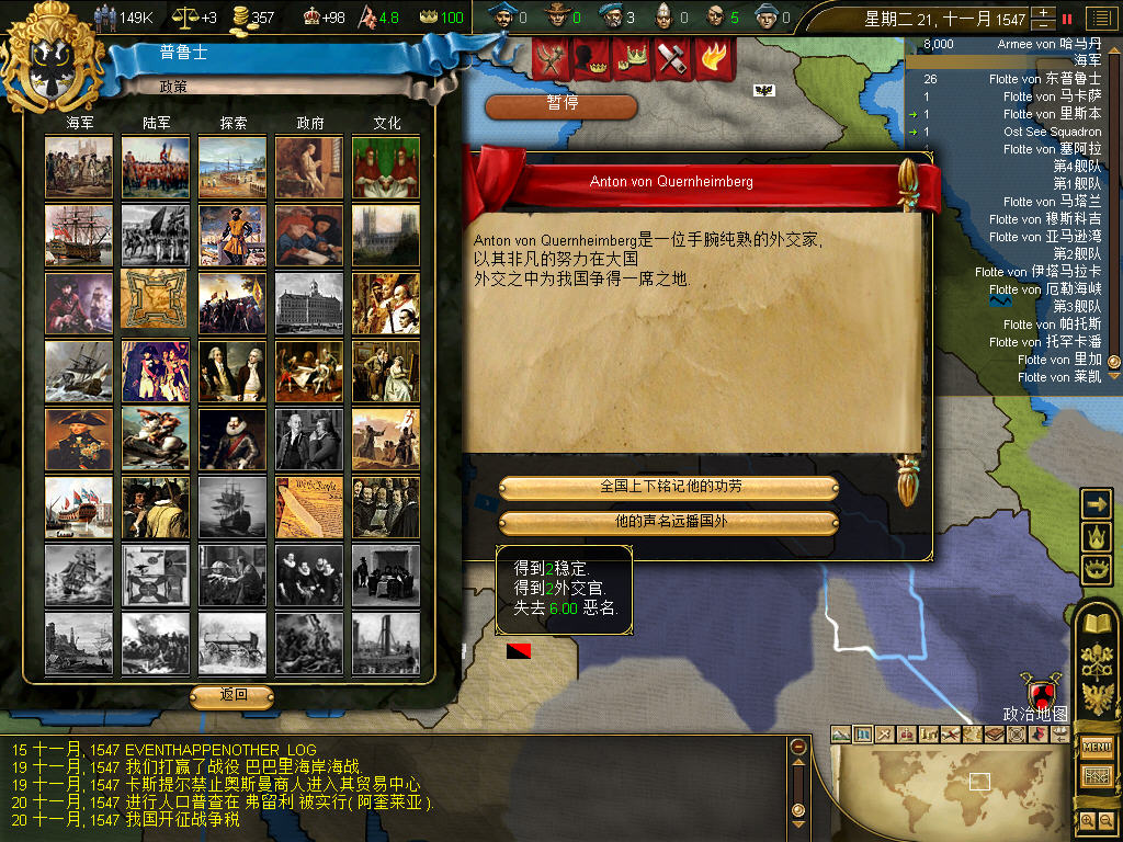 割了奥斯曼十多块地后,又来了国土过度扩张的debuff,+3的叛乱,而普鲁士第一任国王是前条顿的大团长,接班人是大团长的养子奥兰治家族的Wilhelm Friedrich,所以大团长一死,正统性跌倒了20,又加了叛乱风险,将近一年多,什么事没干,净平叛了
