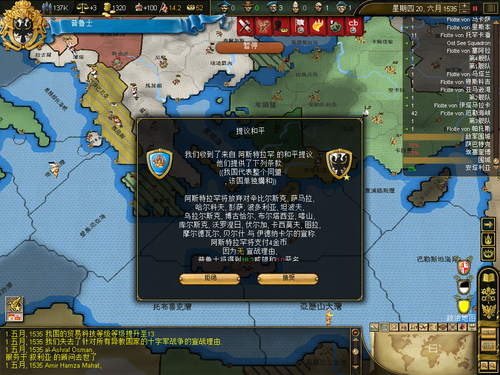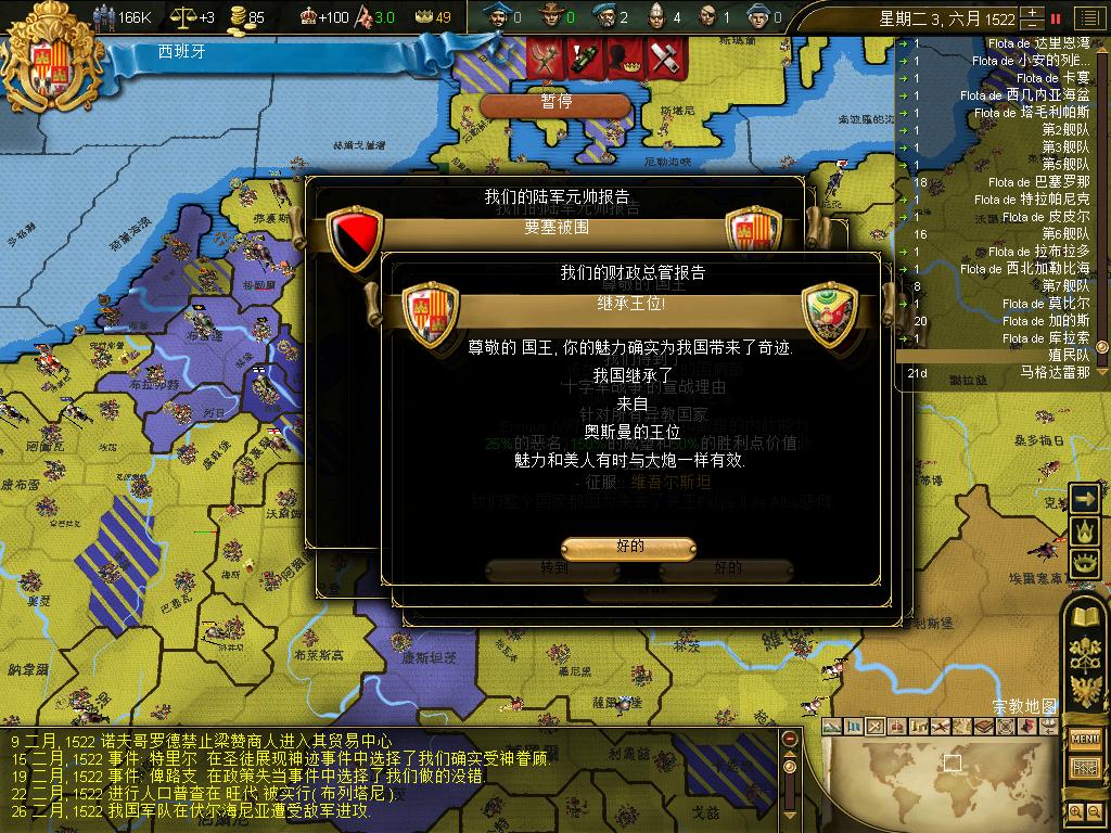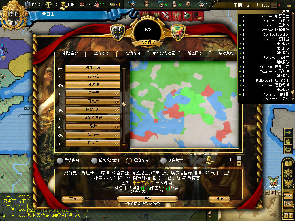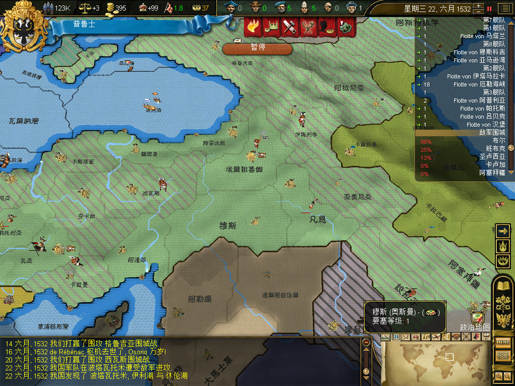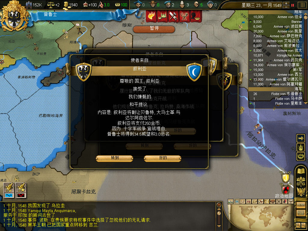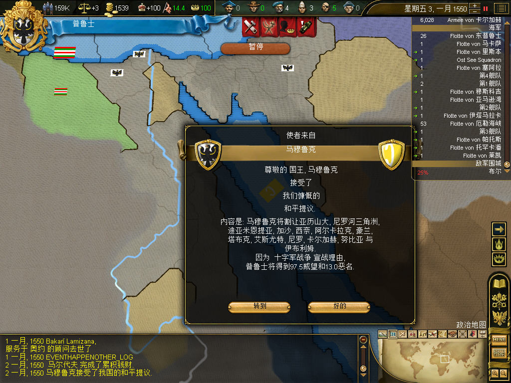 割了奥斯曼十多块地后,又来了国土过度扩张的debuff,+3的叛乱,而普鲁士第一任国王是前条顿的大团长,接班人是大团长的养子奥兰治家族的Wilhelm Friedrich,所以大团长一死,正统性跌倒了20,又加了叛乱风险,将近一年多,什么事没干,净平叛了