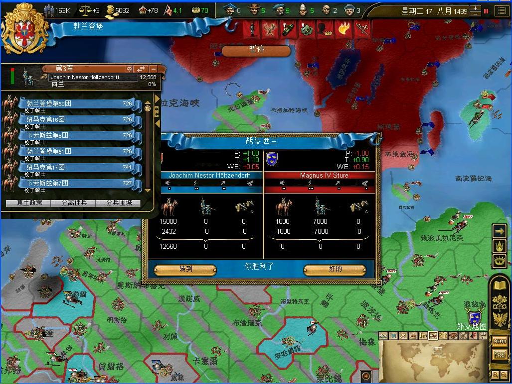 瑞典的8k步兵被困在西兰岛上了,进退不得....大军杀过去,所有的敌军被全歼在了西兰城下,这就是没有强大海军的结果....帝国的海军在波罗的海附近还是可以称霸的...