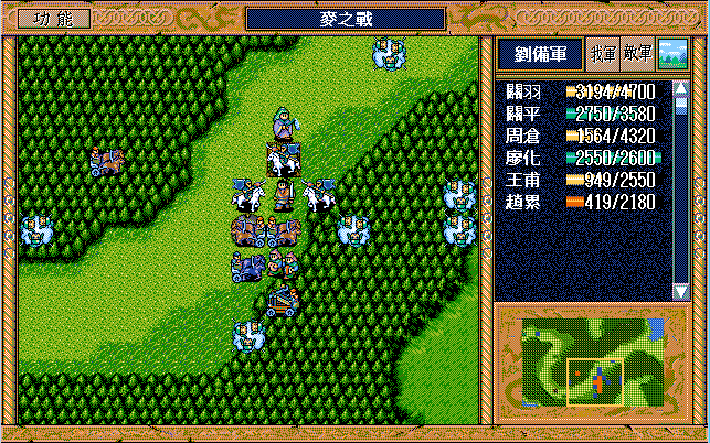 我 吴兰右一援助、黄权上激励吴兰,刘备下假情报骑兵2,马良左下补给刘辟,刘辟牵制弓兵6,糜竺进村庄激励陈式(从此不变位置),陈式上攻击步兵5,马谡上激励藩宫,庞统下一,藩宫右一上二大焦热(失败),刘封右援助藩宫,王平右援助陈式;
