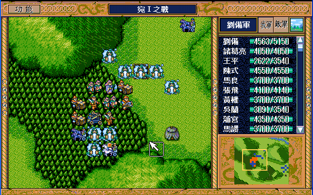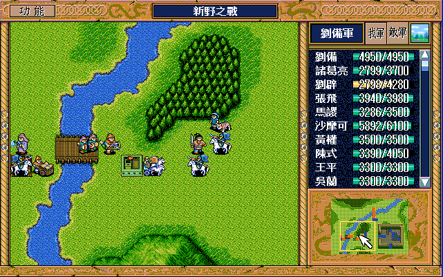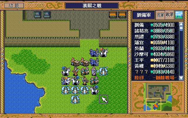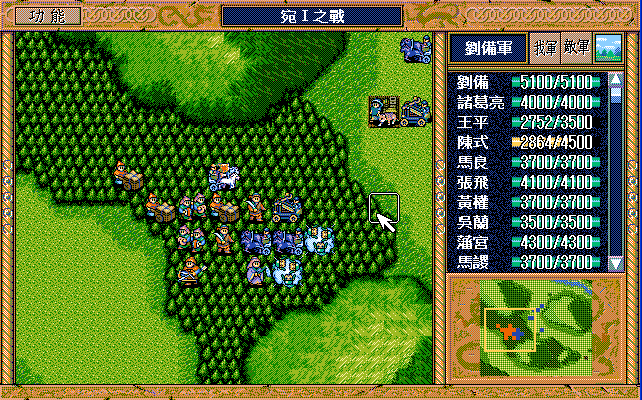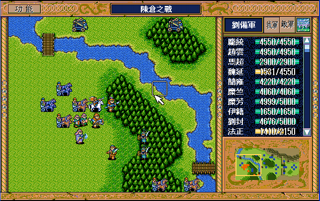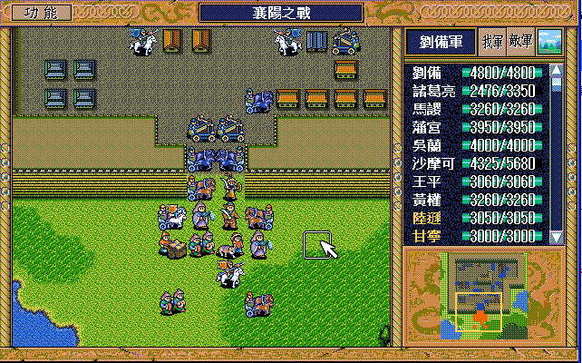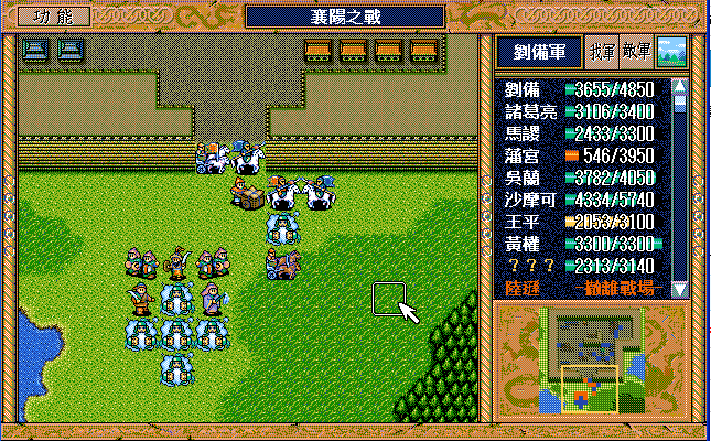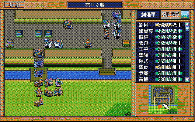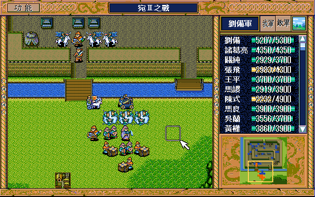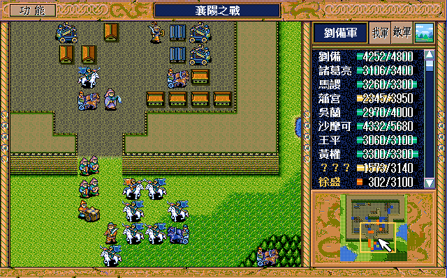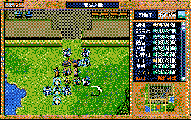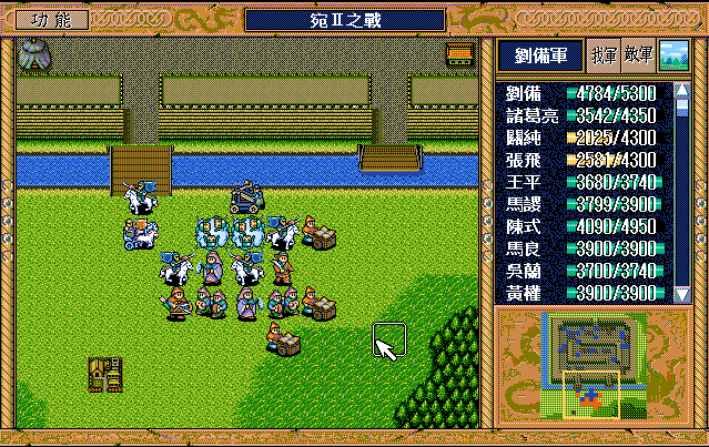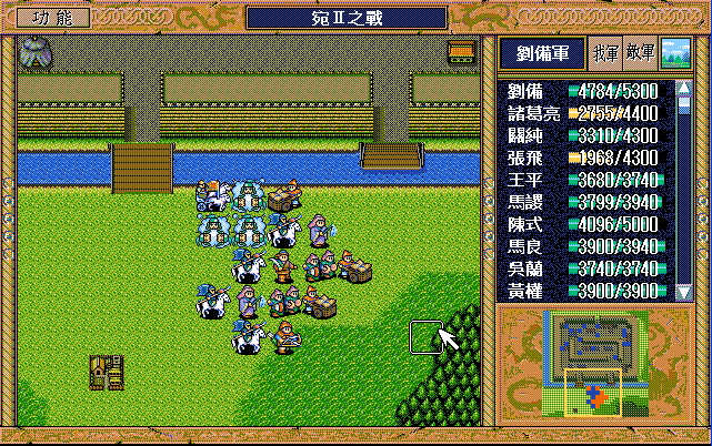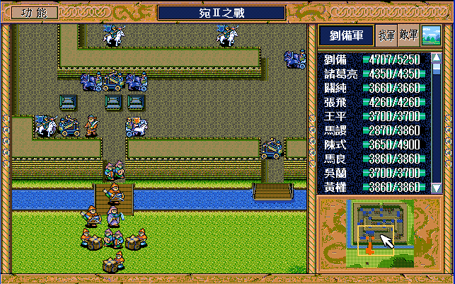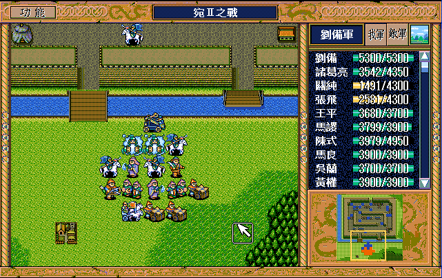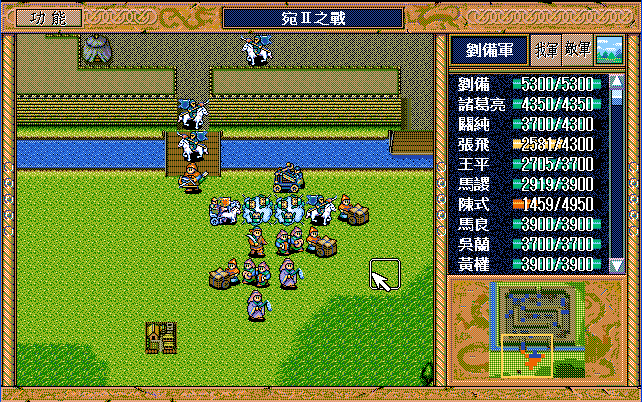 第4回合:孔明把赤兔马交给刘备,刘备助攻沙摩柯灭毛玠,其他人往城外退,潘宫左移,不能给潘宫补血